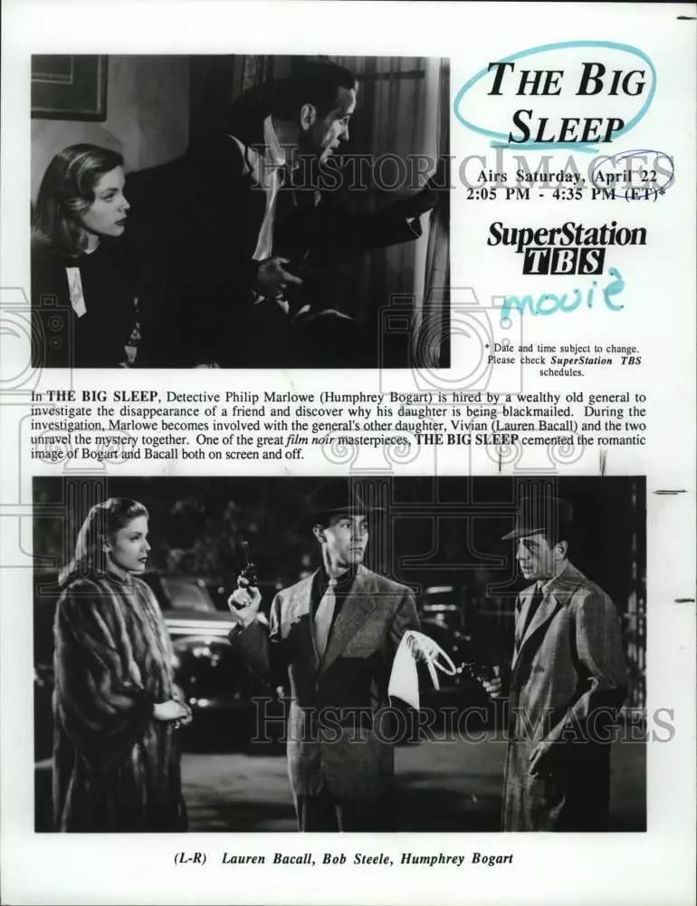 ebay template Note: Please study the images carefully to determine the condition of this vintage photograph, as it may not be in perfect condition. It may contain wrinkles, cracks, and possibly even tears due to its age and how it was handled before it got to us. A scanner may interpret colors and contrast differently than human eyes will, so it is possible that the actual photograph may be slightly darker or lighter in person. This vintage photograph is offered for sale as a collectible item and conveys no transfer of copyright. 1990 Press Photo Actor Humphrey Bogart, co-stars in "The Big Sleep" Movie This is an original press photo. In "The Big Sleep," Detective Philip Marlow (Humphrey Bogart) is hired by a wealthy old general to investigate the disappearance of a friend and discover why his daughter is being blackmailed. During the investigation, Marlow becomes involved with the general's other daughter, Vivian (Lauren Bacall) and the two unravel the mystery together. One of the great film noir masterpieces, "The Big Sleep" cemented the romantic image of Bogart and Bacall both on screen and off.Photo measures 8 x 10.25inches. Photo is dated 04-10-1990. PHOTO FRONT PHOTO BACK Historic Images Part Number: syp42254 FAQs Q: Can I just download a digital version instead? A: No, we sell only vintage originals and do not make or distribute any copies, including digital ones. Q: Do you combine shipping and invoices? A: Multiple photos won on the same seller ID combine automatically through the eBay checkout process. If you encounter problems with this, send us a message via eBay messaging and we will send you an invoice. Due to eBay limitations, we cannot combine items won on our different seller IDs for a single shipping charge. Q: How quickly do you ship the items once paid? A: We ship within one business day after your payment clears. If you do not receive an "order shipped" email from us by the close of the second business day from submitting payment, please e-mail us via eBay messaging. Q: How do you make sure my photograph arrives safely? A: We package each order between two cross-corrugated pieces of cardboard to ensure that the package is as difficult to bend as possible. We then wrap each order in a plastic sheet to help protect against moisture. We want you to rest assured that we take every precaution to ensure that the photograph you receive will be in the same condition in your care as it was in ours. Q: Will the "Historic Images" watermark be on my photo when I receive it? A: No. This is a digital watermark we use to protect our images. It is not printed on the photo. Q: What are your office hours? A: eBay for us is a business, and a very fun one to be in! We are open M-F 9 to 5 (CST). Therefore, we do not return e-mails and phone calls over the weekend. We observe the following holidays: New Years Day, Memorial Day, Fourth of July, Labor Day, Thanksgiving and the day after Thanksgiving, Christmas Eve and Christmas Day. Q: Where did all these vintage photos come from? A: These original vintage photographs are from various news service and newspaper photo archives from locations around the country including: Boston, Detroit, Tampa, Chicago, Denver, Seattle, New Orleans, Milwaukee, Portland, Spokane, and more. We do not copy or reproduce any photographs -- every item is a unique vintage piece that was housed in a news archive. Q: Can I use this photograph in my book/blog/website? A: The short answer is no. There is no transfer of copyright for republication or reproduction with these photographs when you purchase them, and only photographs taken before 1923 are currently automatically in the public domain. Permission from the copyright holder, which usually can be identified from the back of each photo, must be sought to republish or reproduce the image for any purpose. Q: Do you relist items (in case I miss an auction ending)? A: Auction items that receive no bids are relisted in our store (historicimages-store on eBay) as a fixed-price item and at a higher price than the starting auction price. Q: Do you leave feedback? A: Yes, we always leave feedback for buyers. Our software monitors when our buyers leave us feedback, then notifies us that we can leave feedback for the buyer. Rest assured, if you leave feedback, we will do the same! Check out our family of eBay IDs: historicimages01 Sports Photos historicimages02 Entertainment Photos historicimages03 Americana Photos historicimages04 International & War Photos historicimages05 Transportation Photos historicimages06 Photos of All Subjects historicimages07 Entertainment Photos historicimages08 Newsworthy Photos historicimages09 Entertainment Photos historicimages10 Sports Photos historicimages-store Our largest fixed-price selection historicimages-gallery Hand-picked photos Saturday night auctions About Us Historic Images was formed in September 2009, with a handful of scanners working out of a basement to digitize newspaper photo archives. We have since moved out of the basement, and we can now archive thousands of photos per day. Our company has worked with magazines and newspapers from Detroit, Boston, Denver, Seattle, Tampa, Chicago, and New Orleans, just to name a few. We are constantly adding to our inventory, and have assembled an archive of millions of photos to date. As our company evolved, we began our eBay business, which brings thousands of fresh auctions per week to the world's largest online auction marketplace. Our custom software systems and team of great employees allow us to efficiently scan and sell large photo archives online. At the very core of our company's DNA is a strong commitment to customer satisfaction and strict integrity for our product. Our promise to you is that we will do everything in our power to provide you a great buying experience. Copyright 2009 - Present, Historic Images, Inc. Sell Smarter with Kyozou. Inventory and Ecommerce Management