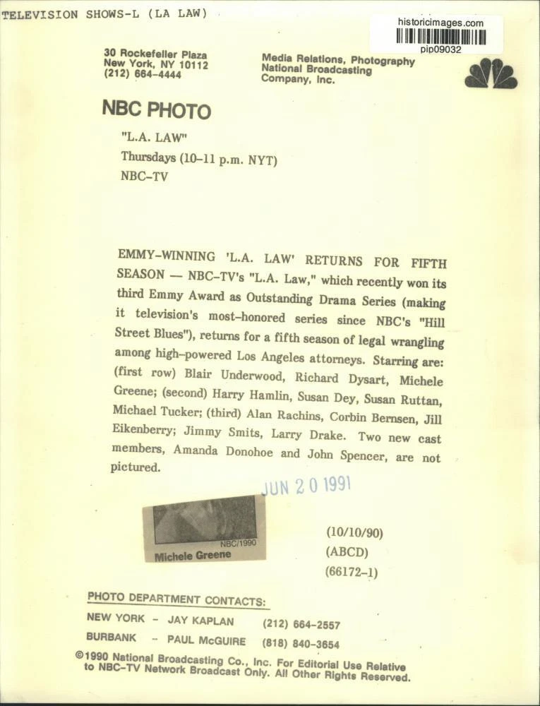 ebay template Note: Please study the images carefully to determine the condition of this vintage photograph, as it may not be in perfect condition. It may contain wrinkles, cracks, and possibly even tears due to its age and how it was handled before it got to us. A scanner may interpret colors and contrast differently than human eyes will, so it is possible that the actual photograph may be slightly darker or lighter in person. This vintage photograph is offered for sale as a collectible item and conveys no transfer of copyright. 1990 Press Photo "L.A. Law" Television Show Cast Members - pip09032 This is an original press photo. Television Shows - L (L.A. Law). NBC-TV's "L.A. Law,†which recently won its third Emmy Award as Outstanding Drama Series (making it television's most-honored series since NBC's "Hill Street Blues"), returns for a fifth season of legal wrangling among high-powered Los Angeles attorneys. Starring are: (first row) Blair Underwood, Richard Dysart, Michele Greene; (second) Harry Hamlin, Susan Dey, Susan Ruttan, Michael Tucker; (third) Alan Rachins, Corbin Bernsen, Jill Eikenberry; Jimmy Smits, Larry Drake. Two new cast members, Amanda Donohoe and John Spencer, are not pictured. Photo measures 7 x 9.25 inches. Photo is dated 10-10-1990. PHOTO FRONT PHOTO BACK Historic Images Part Number: pip09032 Sell Smarter with Kyozou. Inventory and Ecommerce Management