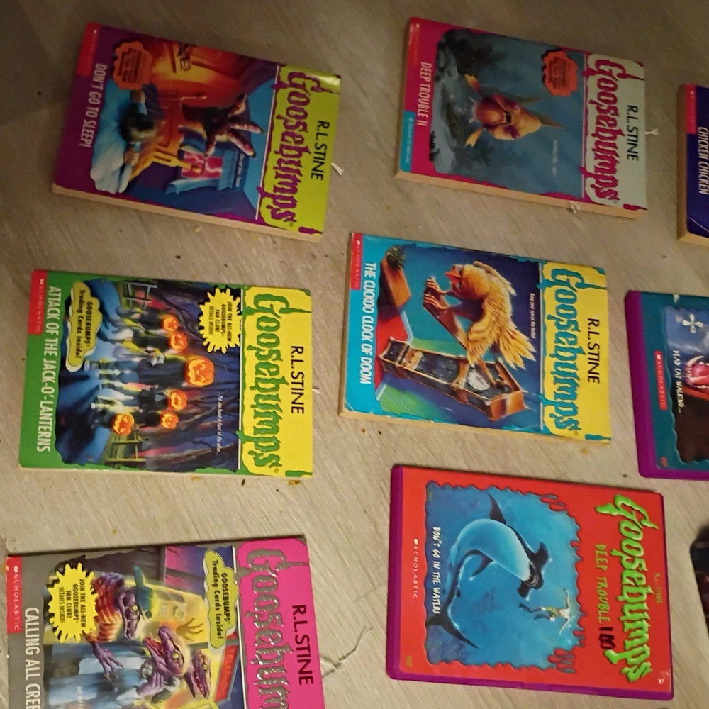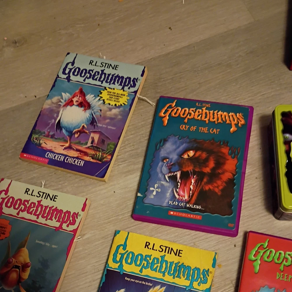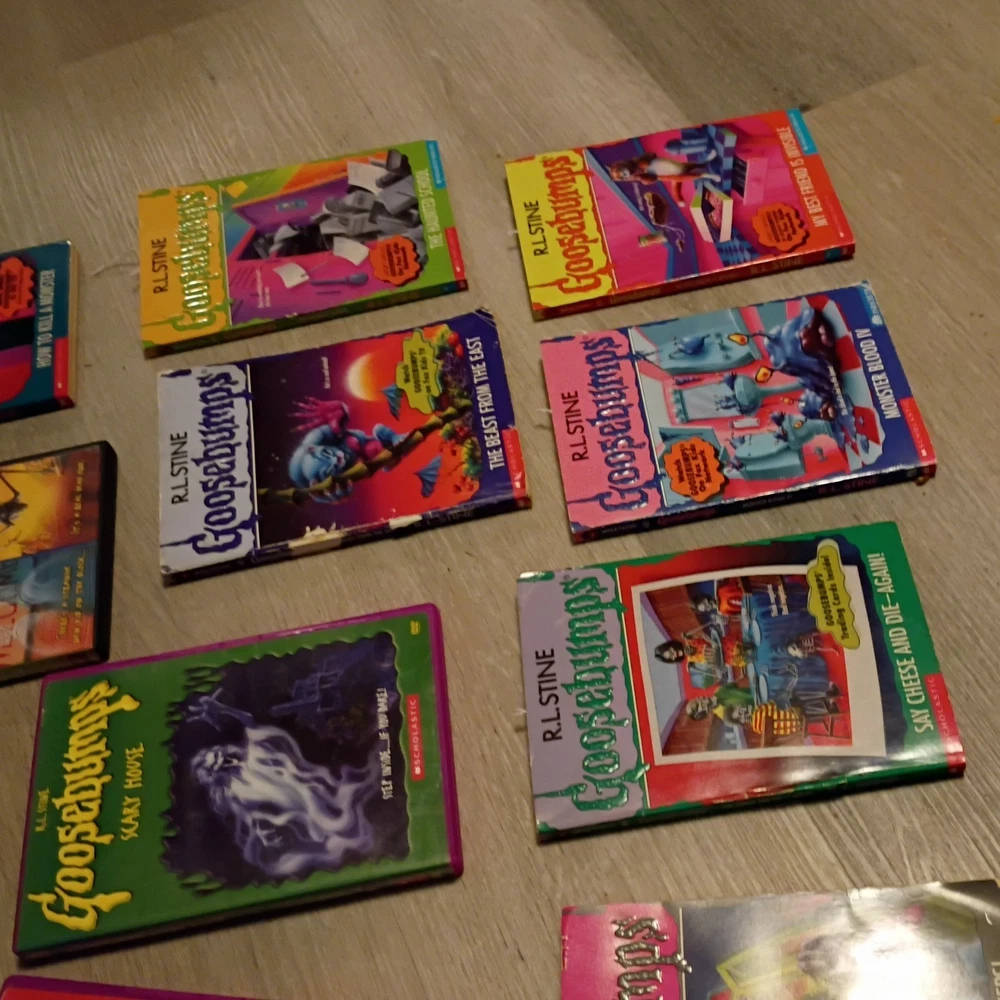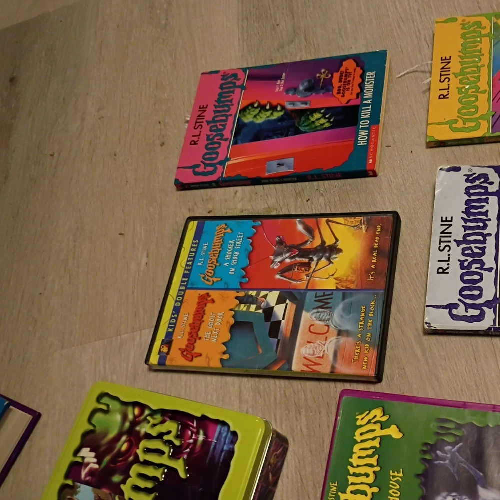you get my best friend is invisible, the haunted school, the beast from the east, monster blood 4, say cheese and die again calling all creeps, attack of the jack-o'-lanterns, don't go to sleep, deep trouble too hard to find rare, chicken, how to kill a monster, and then the collection monster edition number 3 which will be pictured the books are an amazing condition the Cuckoo clock of Doom is a little rough there's a few bins but overall the covers look great the spines look great DVDs all look really pretty good they are untested but the two pack looks pretty good playable for sure step inside if you dare scary house DVD looks good the deep trouble one however is a little scratched up and I don't think it will play and then cry the cat is a little scratched but looks good you also get the large book 10 Goosebumps which is hard to find as well get these all together somewhere else you can't this is a heck of a bundle with rare books