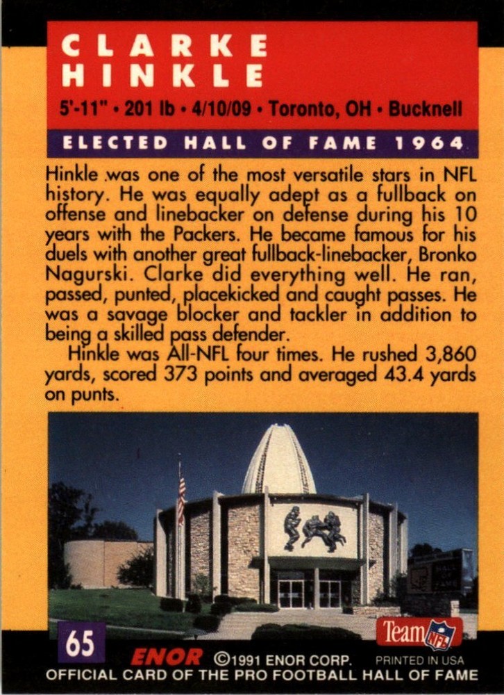 1991 ENOR Pro Football HOF #65 Clarke Hinkle Green Bay Packers Condition: NM-MT