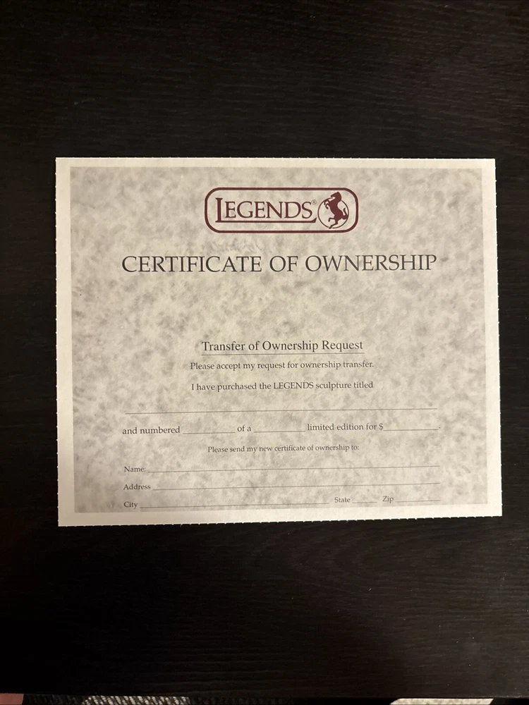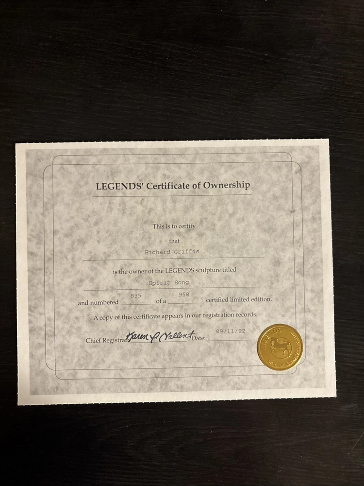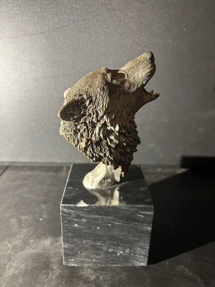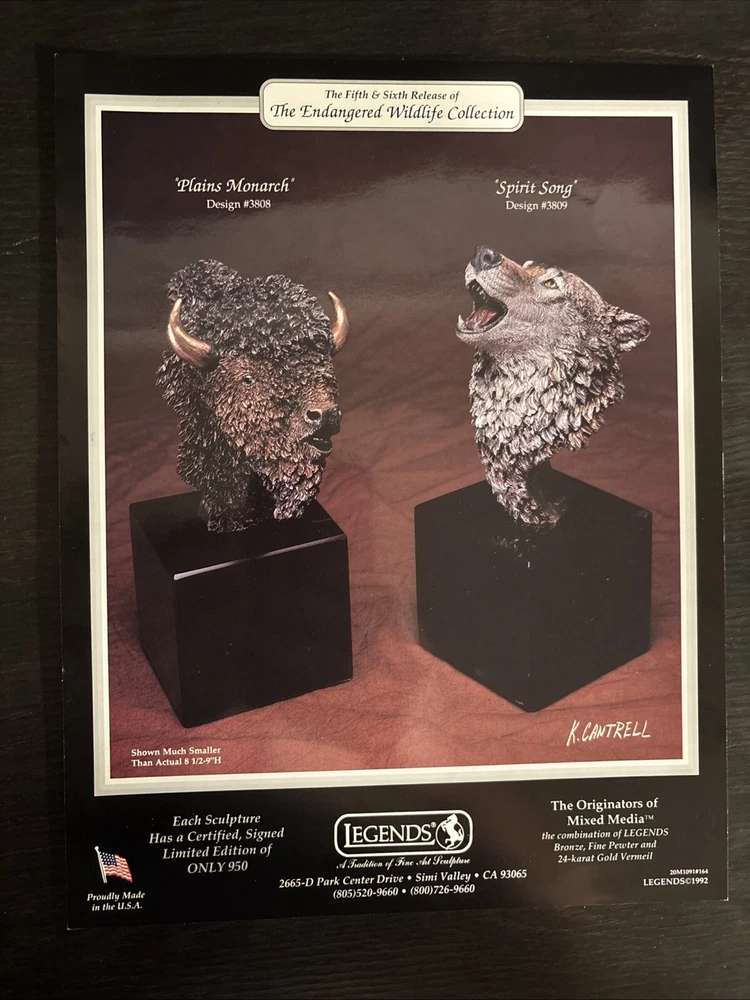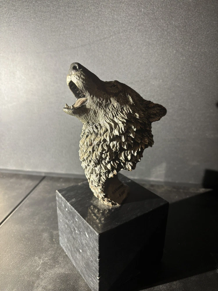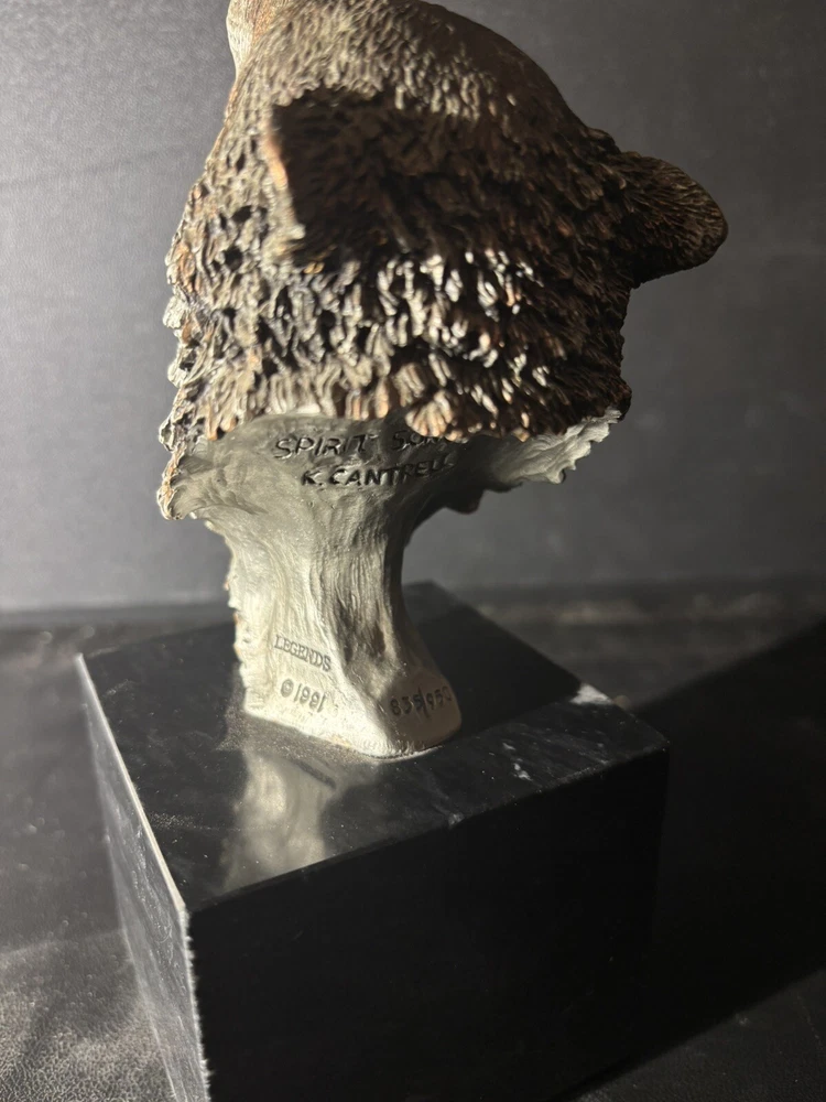 Title: Spirit Song Year Created: 1991 Dimensions: 9” H x 3 1/2” L x 3 1/2” W Weight: 7 lbs Limited Edition: No. 835 of 950 Base Material: Marble What is Mixed Media? Mixed media refers to an intricate blend of fine metals and finishes, including lost wax bronze, fine pewter, brass, copper, and 24-karat gold vermeil. To enhance the sculpture’s aesthetic, artists apply a range of patinas such as black nickel, rose copper, and turquoise, achieved through precision torching techniques. This masterful combination imbues each piece with exceptional texture, color, and depth. About Kitty Cantrell Award-winning artist and devoted environmentalist Kitty Cantrell is celebrated for her breathtaking sculptures of North American wildlife. With an unmatched ability to capture the spirit and raw essence of animals untouched by human hands, Cantrell’s works often feature wolves, eagles, and humpback whales. A native Californian, Kitty has an extraordinary talent for portraying the authentic characteristics of the creatures she sculpts. Her creative process begins with a general concept, evolving into meticulous research to ensure anatomical precision. She pays close attention to the smallest details, from the span of a wing to the curve of a tail, ensuring the utmost authenticity. Kitty’s process involves shaping a preliminary sculpture from soft clay to evaluate form and composition. This is followed by crafting a master sculpture with refined details and anatomical accuracy. Once complete, the final design is sent to the Legends/Genesis foundry in Los Angeles, California, where a resin cast is created, and the production process begins. In line with her passion for wildlife conservation, Kitty Cantrell donates a portion of the proceeds from her art to organizations such as The Nature Conservancy, the World Wildlife Fund, and the Grounded Eagle Foundation, demonstrating her enduring commitment to preserving the natural world. Happy to answer any questions you might have. This piece would be an amazing addition to anyone’s home in a variety of different settings such as a striking office piece or masterpiece on the mantel. The Spirit Song sculpture is a beautiful piece of art that will hold its value for generations to come.