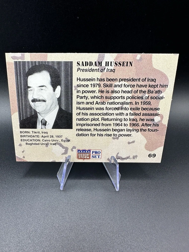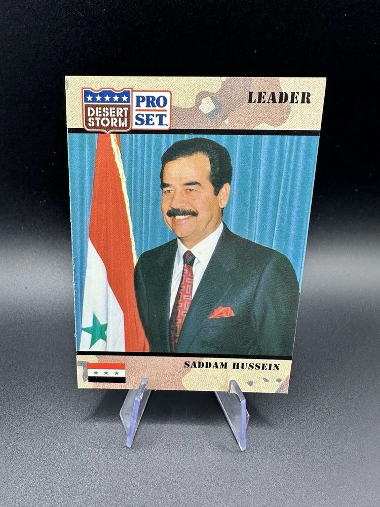 1991 Pro Set Desert Storm #69 | Leader Saddam Hussein NM+. Condition is Ungraded. Shipped with eBay Standard Envelope for Eligible Items up to $20.
