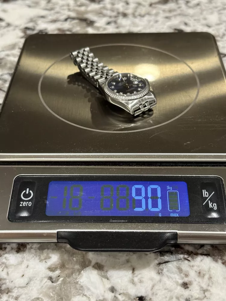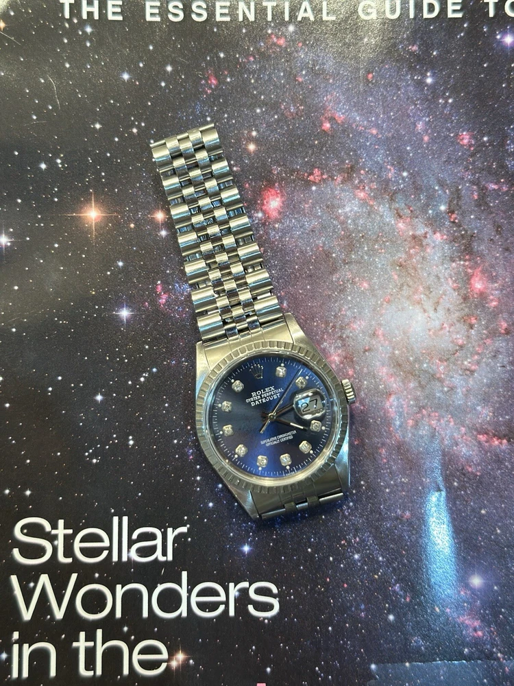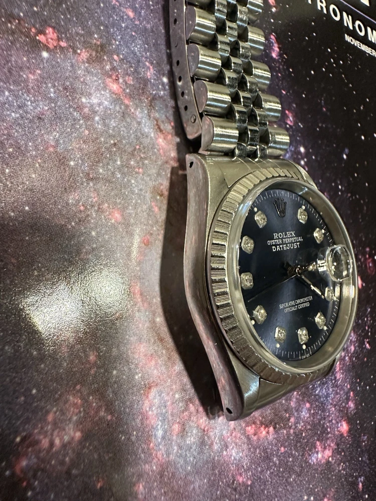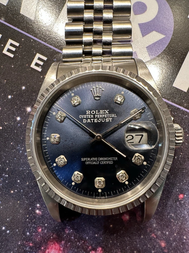 This quintessential Rolex Datejust is an elegant and luxurious timepiece with a stainless steel case and bracelet. The blue dial features diamond hour markers and an instantaneous date indicator, with a jubilee bracelet that completes the classic look. The watch is provided unpolished and in honest condition. It has a self-winding movement, ensuring accuracy and convenience. With a case size of 36mm and a lug width of 20mm, this watch is perfect for men who appreciate a stylish and functional accessory. It would also work as an oversized watch for women. The watch has a folding oysterclasp and Rolex screw down crown and case back. Although it does not come with original box/packaging or papers, this Rolex Datejust watch is a timeless piece that will never go out of style.
