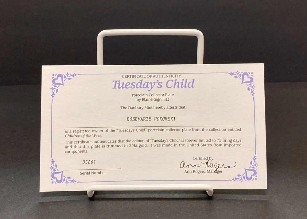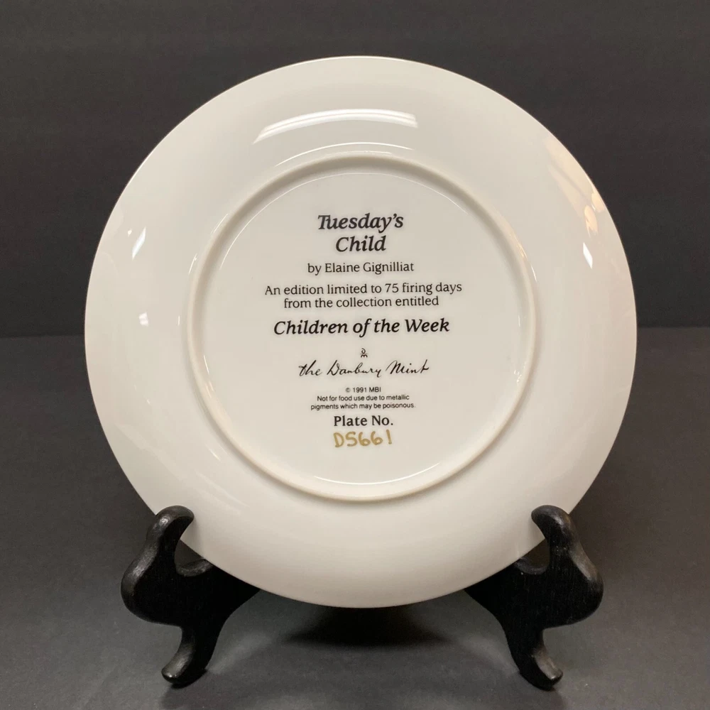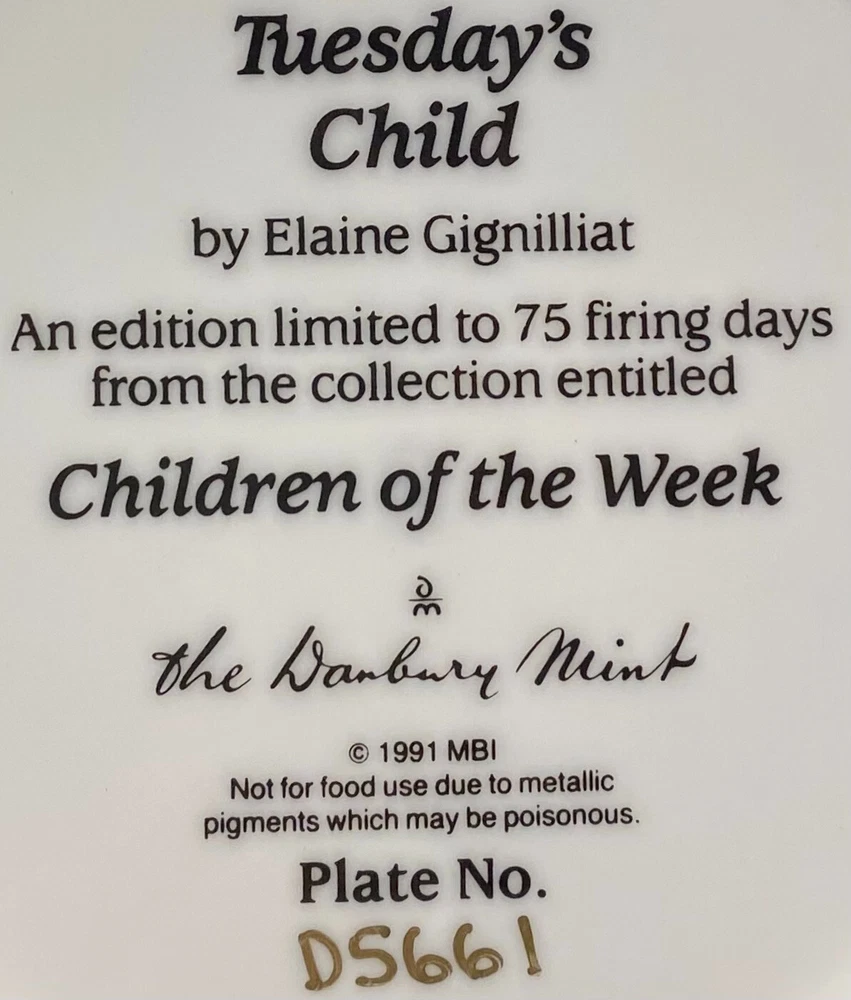1991 "Tuesday's Child" Vintage Limited Edition Plate - Danbury Mint [INCLUDES CERTIFICATE OF AUTHENTICITY] P late #: D5661 Art by Elaine Gignilliat " Children Of The Week " Series NOT TO BE USED FOR FOOD. DECORATION PURPOSES ONLY. [RMP-DC6]