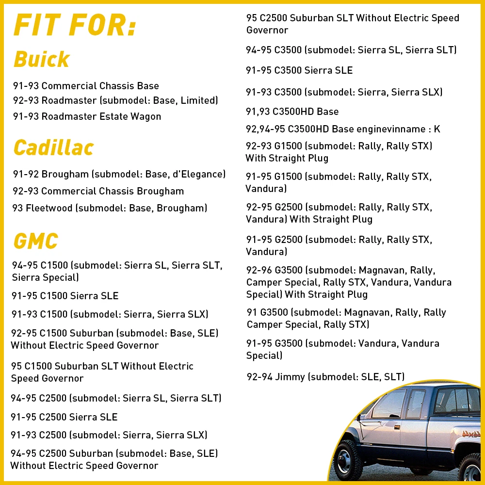 Fit for: Buick 91-93 Commercial Chassis Base 92-93 Roadmaster (submodel: Base, Limited) 91-93 Roadmaster Estate Wagon Cadillac 91-92 Brougham (submodel: Base, d'Elegance) 92-93 Commercial Chassis Brougham 93 Fleetwood (submodel: Base, Brougham) Chevrolet 91-94 Astro (submodel: Base, CL, CS, LT) 94 Blazer (submodel: Base, Silverado Sport) 92-93 Blazer Cheyenne 91 Blazer Scottsdale 91-94 Blazer Silverado 94-95 C1500 Base 91-95 C1500 (submodel: Cheyenne, Silverado, WT) 92-95 C1500 Suburban Base 95 C1500 Suburban (submodel: LS, LT) 92-94 C1500 Suburban Silverado Fit 1991-1995 New C1500 Chevrolet Idle Control & Valve Throttle Position Sensor Fit for: Buick 91-93 Commercial Chassis Base 92-93 Roadmaster (submodel: Base, Limited) 91-93 Roadmaster Estate Wagon Cadillac 91-92 Brougham (submodel: Base, d'Elegance) 92-93 Commercial Chassis Brougham 93 Fleetwood (submodel: Base, Brougham) Chevrolet 91-94 Astro (submodel: Base, CL, CS, LT) 94 Blazer (submodel: Base, Silverado Sport) 92-93 Blazer Cheyenne 91 Blazer Scottsdale 91-94 Blazer Silverado 94-95 C1500 Base 91-95 C1500 (submodel: Cheyenne, Silverado, WT) 92-95 C1500 Suburban Base 95 C1500 Suburban (submodel: LS, LT) 92-94 C1500 Suburban Silverado 94-95 C2500 (submodel: Base, WT) 91-95 C2500 (submodel: Cheyenne, Silverado) 95 C2500 Suburban (submodel: LS, LT) 92-95 C2500 Suburban Base 92-94 C2500 Suburban Silverado 94-95 C3500 Base 91-95 C3500 (submodel: Cheyenne, Silverado) 91-95 C3500HD Base 91-92 Camaro RS 92 Camaro RS Heritage Edition 91-92 Caprice Base 93 Caprice Classic LS 91-93 Caprice (submodel: Classic, Classic LTZ) 91-92 Commercial Chassis Base 92-93 G10 Sportvan With Straight Plug 91-95 G10 (submodel: Beauville, Chevy Van, Sportvan) 92-95 G20 (submodel: Beauville, Chevy Van, Sportvan) With Straight Plug 91-95 G20 (submodel: Beauville, Chevy Van, Sportvan) 92-96 G30 (submodel: Beauville, Chevy Van, Hi-Cube, Sportvan) WithStraight Plug 91-93 G30 Beauville 91-96 G30 Chevy Van 91-95 G30 Hi-Cube 91 G30 Sportvan 94-95 K1500 Base 91 K1500 Sport 91-95 K1500 (submodel: Cheyenne, Silverado, WT) 92,94 K1500 Suburban (submodel: Base, Silverado) Without Electric Speed Governor 95 K1500 Suburban (submodel: LS, LT) 93,95 K1500 Suburban Base 93 K1500 Suburban Silverado 94-95 K2500 (submodel: Base, WT) 91-95 K2500 (submodel: Cheyenne, Silverado) 95 K2500 Suburban (submodel: LS, LT) 92-95 K2500 Suburban Base 92-94 K2500 Suburban Silverado 94-95 K3500 Base 91-95 K3500 (submodel: Cheyenne, Silverado) 91-95 Lumina APV Base 91-92 Lumina APV CL 93-95 Lumina APV LS 91-95 P30 Base 97 P30 Base 6 Terminals 94-95 S10 (submodel: LS, SS, ZR2) 92-95 S10 Base 92-93 S10 EL 92 S10 Tahoe 91 S10 (submodel: Baja, Base, Tahoe) With Round Connector 92-94 S10 Blazer (submodel: Base, Tahoe, Tahoe LT) 94 S10 Blazer LT 92 S10 Blazer Sport 91 S10 Blazer (submodel: Base, Tahoe, Tahoe LT) With Round Connector 95 Tahoe (submodel: Base, LS, LT) GMC 94-95 C1500 (submodel: Sierra SL, Sierra SLT, Sierra Special) 91-95 C1500 Sierra SLE 91-93 C1500 (submodel: Sierra, Sierra SLX) 92-95 C1500 Suburban (submodel: Base, SLE) Without Electric Speed Governor 95 C1500 Suburban SLT Without Electric Speed Governor 94-95 C2500 (submodel: Sierra SL, Sierra SLT) 91-95 C2500 Sierra SLE 91-93 C2500 (submodel: Sierra, Sierra SLX) 94-95 C2500 Suburban (submodel: Base, SLE) Without Electric Speed Governor 95 C2500 Suburban SLT Without Electric Speed Governor 94-95 C3500 (submodel: Sierra SL, Sierra SLT) 91-95 C3500 Sierra SLE 91-93 C3500 (submodel: Sierra, Sierra SLX) 91,93 C3500HD Base 92,94-95 C3500HD Base enginevinname : K 92-93 G1500 (submodel: Rally, Rally STX) With Straight Plug 91-95 G1500 (submodel: Rally, Rally STX, Vandura) 92-95 G2500 (submodel: Rally, Rally STX, Vandura) With Straight Plug 91-95 G2500 (submodel: Rally, Rally STX, Vandura) 92-96 G3500 (submodel: Magnavan, Rally, Raly Camper Special, Rally STX, Vandura, Vandura Special) With Straight Plug 91 G3500 (submodel: Magnavan, Rally, Rally Camper Special, Rally STX) 91-95 G3500 (submodel: Vandura, Vandura Special) 92-94 Jimmy (submodel: SLE, SLT) 91-94 Jimmy Base 93-94 Jimmy SLS 94-95 K1500 (submodel: Sierra SL, Sierra SLT, Sierra Special) 91-95 K1500 Sierra SLE 95 K1500 Sierra SLS 93 K1500 Sierra Sport 91-93 K1500 (submodel: Sierra, Sierra SLX) 92-95 K1500 Suburban (submodel: Base, SLE) Without Electric Speed Governor 95 K1500 Suburban SLT Without Electric Speed Governor 94-95 K2500 (submodel: Sierra SL, Sierra SLT) 91-95 K2500 Sierra SLE 91-93 K2500 (submodel: Sierra, Sierra SLX) 92-95 K2500 Suburban (submodel: Base, SLE) Without Electric Speed Governor 95 K2500 Suburban SLT Without Electric Speed Governor 94-95 K3500 (submodel: Sierra SL, Sierra SLT) 91-95 K3500 Sierra SLE 91-93 K3500 (submodel: Sierra, Sierra SLX) 91-95 P3500 Base 91 R3500 (submodel: Base, SLE) 91 S15 Jimmy (submodel: Base, SLE, SLS, SLT) With Round Connector 93 Safari GT 94 Safari SLX 91-94 Safari (submodel: Base, SLE, SLT) 92-93 Sonoma Base 94-95 Sonoma SL 92-95 Sonoma SLE 93-95 Sonoma SLS 91 Sonoma (submodel: Base, SLE) With Round Connector 91 V3500 (submodel: Base, SLE) 92-95 Yukon (submodel: Base, SLE) 93 Yukon GT 95 Yukon SLT 92,94 Yukon Sport Isuzu 93-95 NPR Base 91 Pickup LS 91-92 Pickup S 91-92 Rodeo (submodel: LS, S, XS) Oldsmobile 92 Bravada Base 91 Bravada Base With Round Connector 91-92 Custom Cruiser Base 91-94 Silhouette Base Pontiac 91-92 Firebird (submodel: Base, Formula, Trans Am, Trans Am GTA) 91-95 Trans Sport Base Specifications: Material: ABS+ stainless steel OE number: TH42, 213-895, SS10425, AC1, 217-437 Functions: *Direct replacement without modifications is easy to install,and fit your vehicle perfectly. *Our product with procision manufactured is accord with OE standard, please confirm the OE number before purchasing! *They are tested under extreme conditions to prevent crack, splitting, or deform. Packaging include: Throttle position sensor*1 Idle Control Valve*1 Item Specifics Features Easy Installation Manufacturer Warranty 1 Year Con