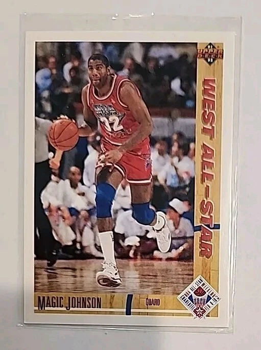 This 1991-92 Upper Deck Magic Johnson #57 sports trading card features the legendary NBA player in his prime. With its bold design and high-quality printing, it's a must-have for any basketball fan's collection. The card showcases Johnson in action, wearing his NBA All-Star Team jersey, and is perfect for display or trading. As a part of the 1991-92 Upper Deck set, this card is a valuable addition to any sports trading card collection. It's an excellent way to commemorate Johnson's career and achievements, and is sure to be a conversation starter among basketball enthusiasts. Whether you're a seasoned collector or just starting out, this card is a great choice for anyone looking to add a piece of NBA history to their collection.