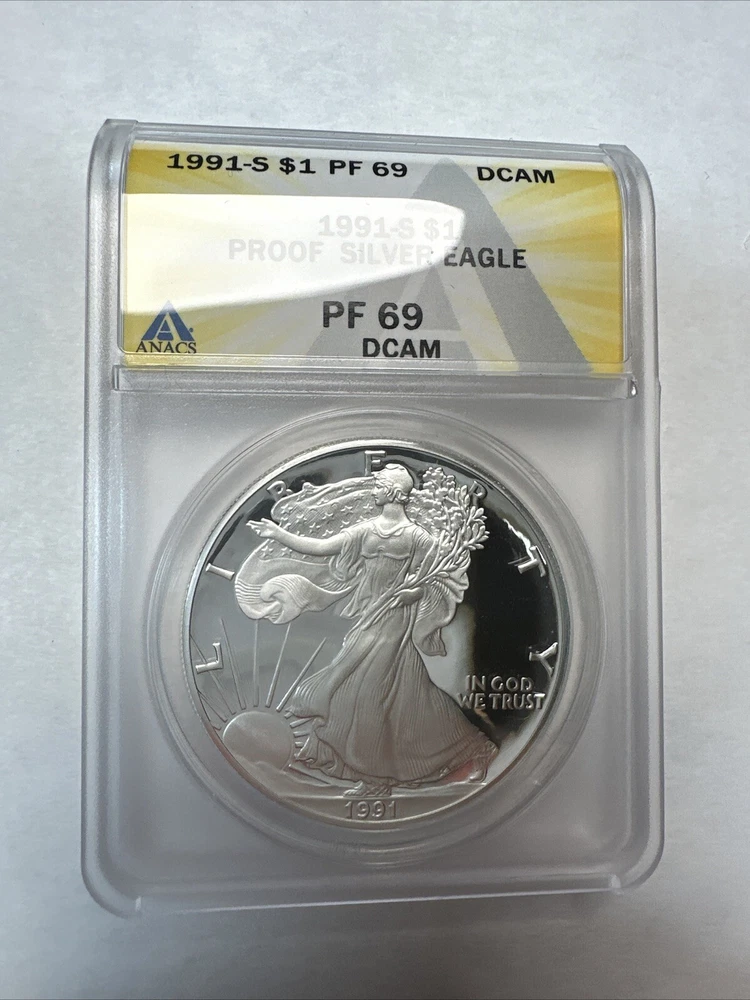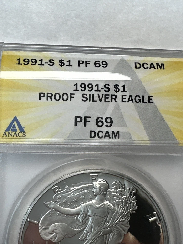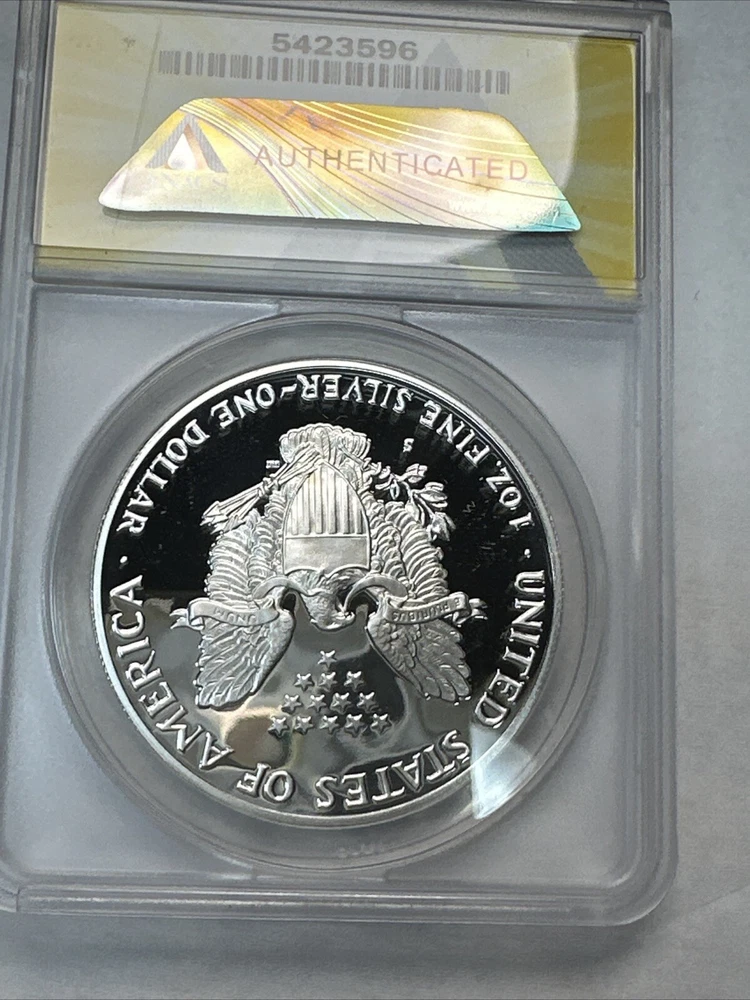 This 1991-S American Silver Eagle $1 is a highly sought-after coin with a PR 69 grade. It features a stunning strike type with a proof finish and a composition of 0.999 fine silver. The coin has been certified by ANACS with a certification number of 5423596, ensuring its authenticity and quality. This 1oz coin is a must-have for any serious collector of American coins. It features the iconic American Eagle design on the obverse and a majestic eagle landing on the moon on the reverse. This coin is a true gem and a valuable addition to any collection.