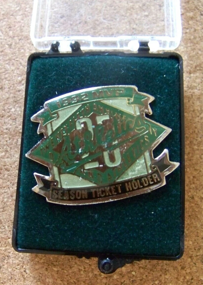 1992 MVP Season Ticket Holder Oakland Athletics A's pin 25th Anniversary Item Description: Type: MLB licensed, silver tone, post and tie-clasp backed, lapel / hat pin Size: measures about 1.5" wide Condition: Excellent condition, minor nicks, marks, light yellowing. Toning on the back. Snap-tite plastic box - some wear, nicks and scratches. There is a crack across the bottom of the box diagonally. No chips or broken hinges/snaps Packaging: snap-tite plastic box Packaging condition: some wear, nicks and scratches. There is a crack across the bottom of the box diagonally. No chips or broken hinges/snaps Shipping: Shipping Time : 1 business day of receiving cleared payment, Mondays thru Fridays. U.S.A. Shipping Costs: FREE! Payment: PayPal is the fastest method, just use the link after buying the listing. Return Policy: Returns accepted, buyer pays return shipping unless there’s an error on seller’s part. Additional Information: Full e-mail support for inquiries or problems. HIGH COUNTRY COLLECTIBLES Since 1989 – A LEADER IN THE DENVER SPORTS MEMORABILIA MARKET. Check out my other auctions and listings, and keep an eye out for the different, unusual, and EXCLUSIVE items available nowhere else but from High Country Collectibles. Don’t forget to click on my "Stores" link, next to my eBay name, to see other items I currently have listed for sale, or you can copy and paste this address into your browser: stores.ebay.com/highcountrycollectibles