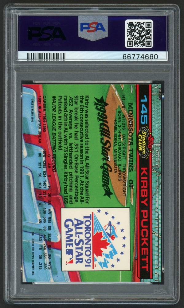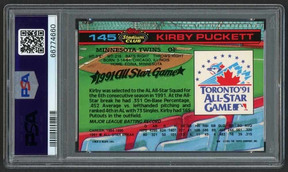 Product: Single Original/Reprint: Original Card Number: 145 Parallel/Variety: SKYDOME Year Manufactured: 1992 Type: Sports Trading Card Original/Licensed Reprint: Original Professional Grader: Professional Sports Authenticator (PSA) Sport: Baseball Player/Athlete: Kirby Puckett Manufacturer: Topps Card Name: SKYDOME Season: 1991 Language: English Theme: Sport Grade: 10 Card Size: Standard Set: 1992 Stadium Club Certification Number: 66774660 Era: Modern (1981-Now) Autographed: No Team: Minnesota Twins League: Major League (MLB) Country/Region of Manufacture: United States