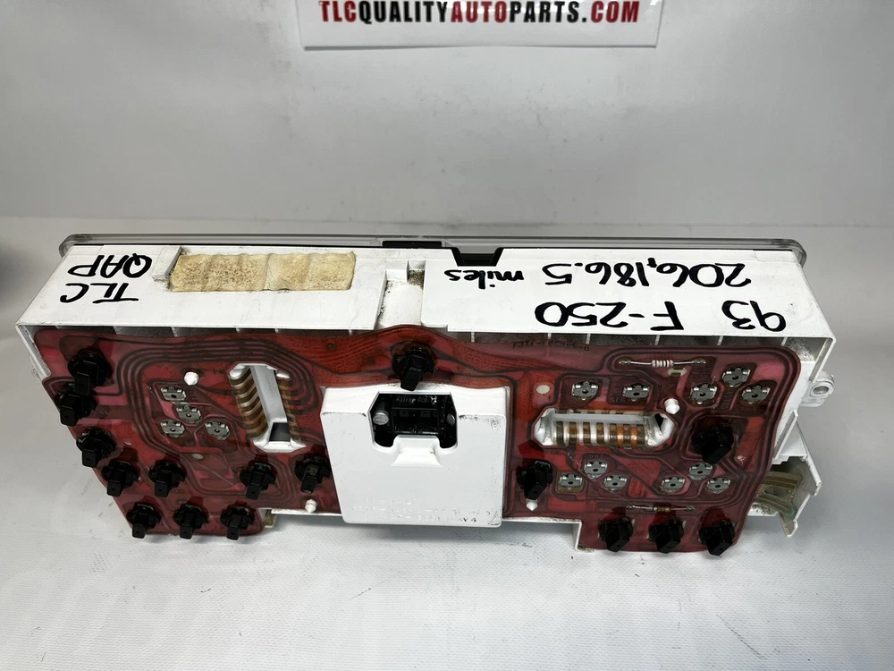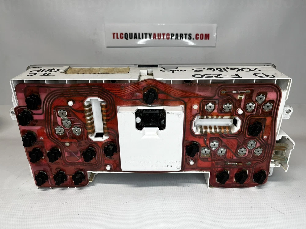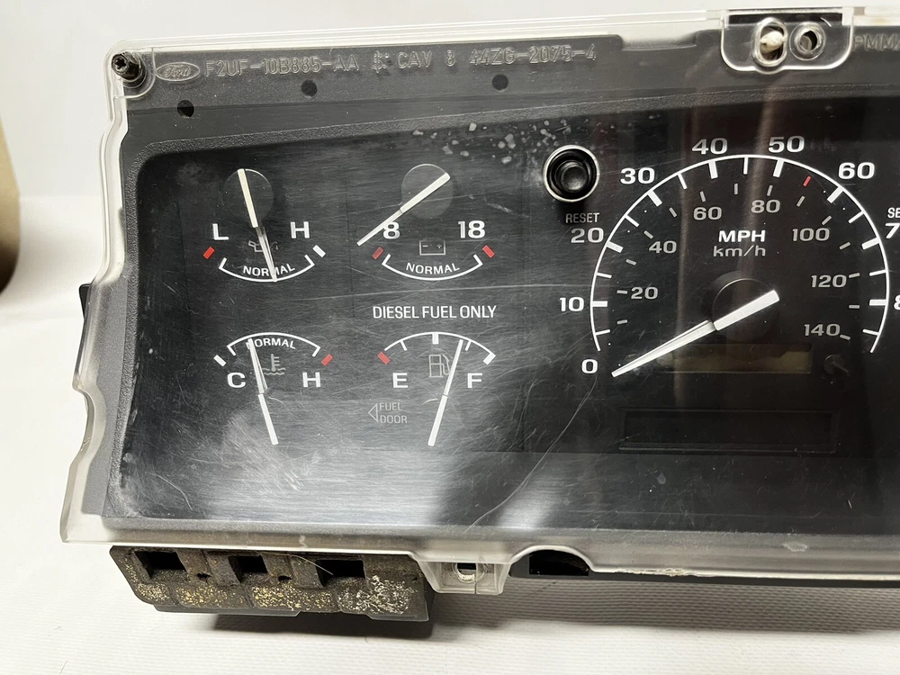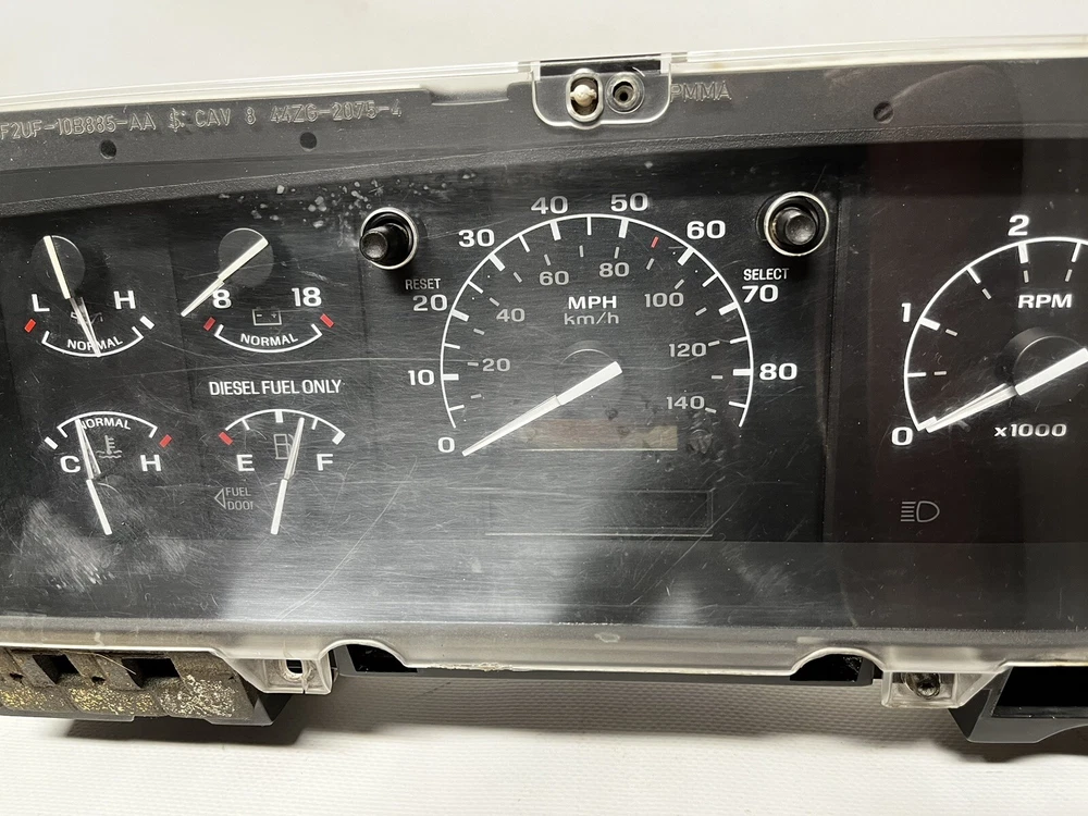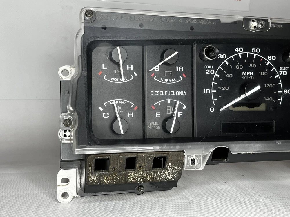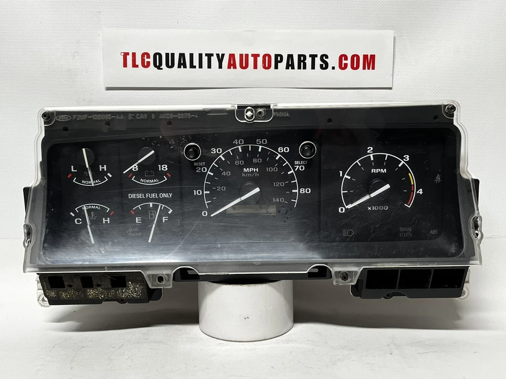 *Cluster is in very rough shape and was exposed to moisture; unit is untested and being sold for parts or repair only!* Welcome to TLC Quality Auto Parts Here is a nice instrument cluster in rough condition while showing normal wear; see all photos for exact condition. Please read below for fitment and compatibility. Fitment is buyer’s responsibility. Additional notes: Lens has many scratches, see photos! Odometer display has bled out; Cluster was exposed to moisture and is being sold for parts or repair only! Donor Vehicle Year: 1993 Make: Ford Model: F-250 Mileage: 206,186.5 miles Fitment & Compatibility 1992-1993 F-Series trucks with a 7.3L Diesel engine: F-250, F-350, and F-450 (F-Super Duty) Shipping, Warranty, & Returns All items are shipped within two business days of receiving cleared payment. Worldwide shipping! 30-day money back warranty beginning when buyer receives item. Warranty ONLY covers parts, no labor. Please contact before starting a return or leaving negative feedback. If you are happy with your purchase, please leave a positive feedback; it means a lot! Thank you for shopping with TLC Quality Auto Parts!