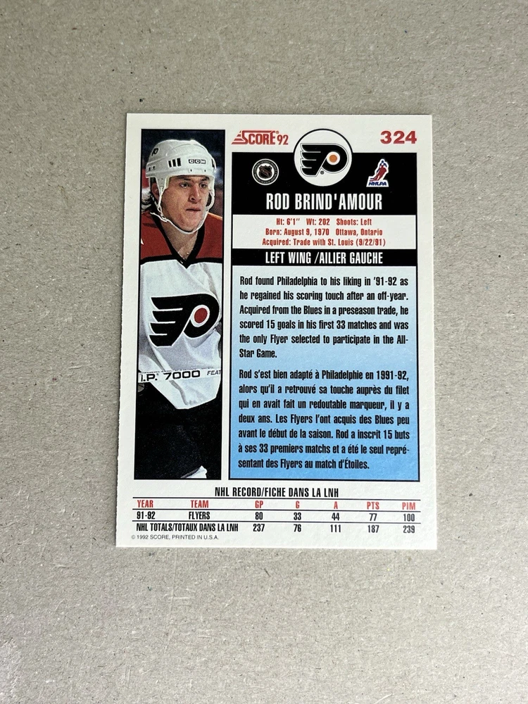 This 1992-93 Score Canadian Hockey #324 Rod Brind'Amour trading card is a must-have for any Philadelphia Flyers fan. The card features Brind'Amour, a former NHL player and Hall of Famer, in his prime during the modern era of hockey. The card is an original from the Pinnacle/Score card manufacturer and is in excellent shape, making it a valuable addition to any collection. The card is a single trading card from the 1992-93 Score Canadian set and features Brind'Amour's name, team, and card number. It is perfect for collectors who are looking for an authentic and high-quality trading card to add to their collection. Whether you're a die-hard fan or a collector, this Rod Brind'Amour trading card is a great investment and a valuable piece of sports memorabilia.