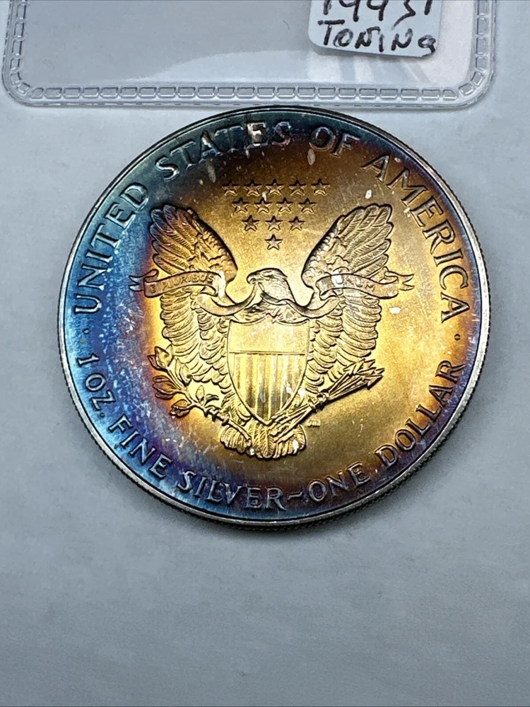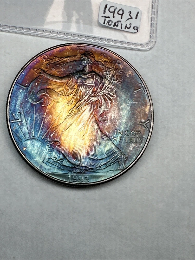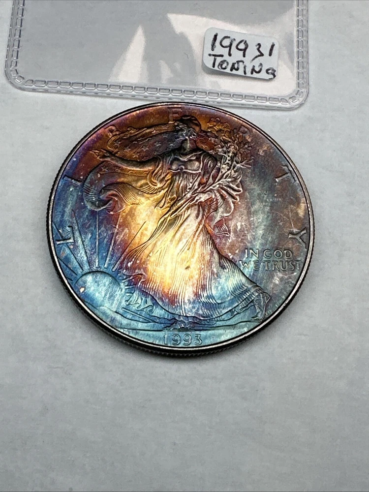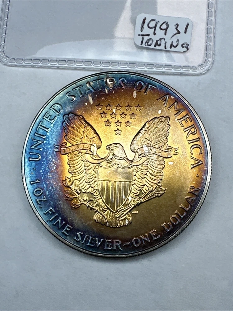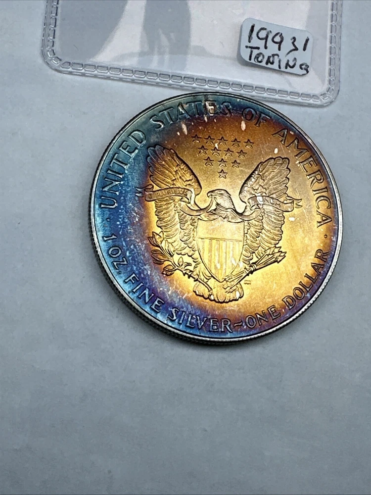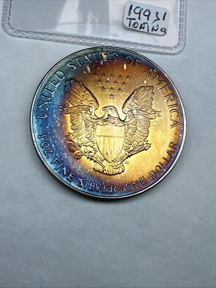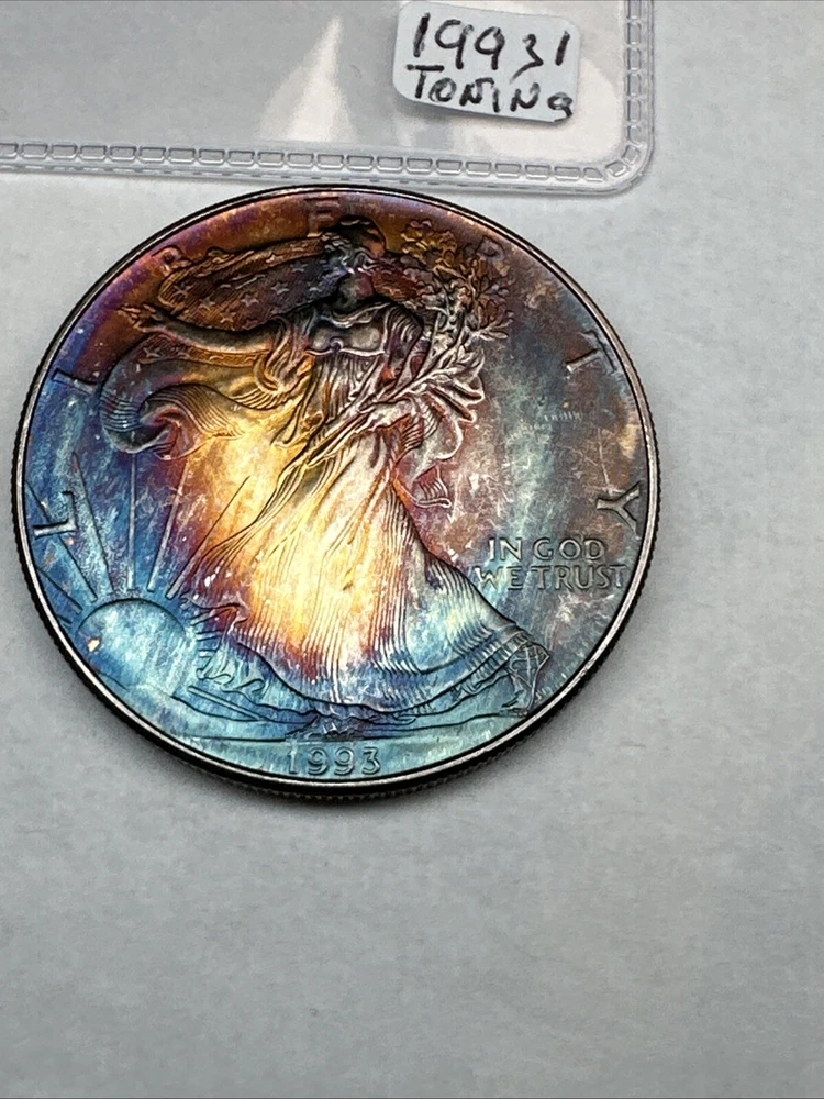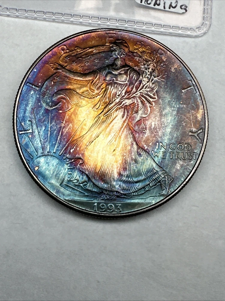 1993 American Silver Eagle! $1 1oz 0.999 Fine Cool Rainbow Toning! Uncirculated