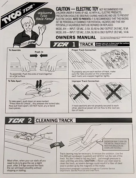 This listing is ONE (1) TYCO TCR, Total Control Racing, vintage 1993 Slotless HO scale slot car RACE SET. The components are all New Old Factory Stock that was originally intended to be used to assemble race sets. All track needs some scotch-brite pad brightening of the rails. WD-40 on a rag will help rejuvenate the track appearance & will help to repel moisture. The TYCO TCR system will accept vehicles like Aurora Speedsteer or Ideal TCR as well. On my web site, under guides, i have several in depth essays on TCR racing. The AC powered system works well & has a degree of difficulty that is unexpected. Although the entire track system has integrated guardrails, flying off the track is still probable at higher speeds. Shifting lanes is actuated with a steering wheel on the controller. Applying the wheel while going too slow results in a vehicle stall; do it too late, & the corner wall divider, takes you out. Adding a JAM (available separate) car creates a situation where one has to get around the moving obstacle! Using a second JAM vehicle (available separate) allows one car to go in each direction to warm up the track. JAM vehicles are very inexpensive. Typical is a Mustang 5.0 or an Emergency Van. TCR RACING IS A HOBBY & NOT A TOY. Adult supervision, setup & participation are CRUCIAL to a good user experience. Everything is included to get started. Parts, Vehicles & Track Accessories are widely available. INCLUDED IN THIS LISTING ARE: (2) TCR Race Cars, (1) 15" Terminal Straight Track, (3) 15" Straight Tracks, (6) 9" Straight Tracks, (2) 6" Straight Tracks, (4) 1/4 9" Curves, (2) Speed Controllers, (1) AC Transformer, (6) Obstacle Pylons & a Scotch-Brite cleaning pad. Also included are some free chassis tune up parts! Sold as is. Descriptions are very accurate; No Returns. PLEASE ASK QUESTIONS BEFORE YOU BUY IF YOU ARE UNSURE. We ship promptly & professionally. We happily combine orders & refund any excess s/h immediately upon shipping. We can always provide tracking. I charge $1 for expert handling/packaging, & actual shipping. We ship out of the country almost daily. Please refer to our feedback, social media or time selling HO slot cars for assurances of a good honest deal. Happy motorin' & thanks S'lots from Bob at Slot Car Central in SYR. We Know H.O.