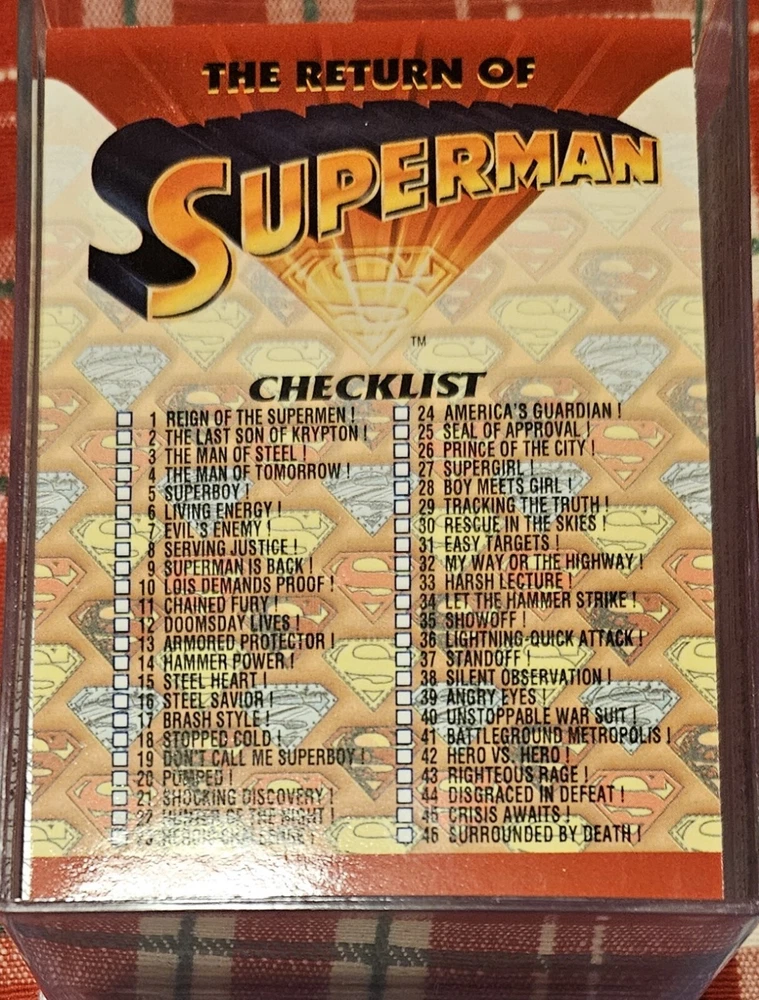 Lot includes: -Complete set 1994 Skybox The Return of Superman #1-100 -The Return of Superman insert SP1 -2 Promo cards for DC Bloodlines -DC Firepower embossed Promo card. -DC power chrome legend 95 Promo card. -Plus Promo card for Skybox Batman master series.