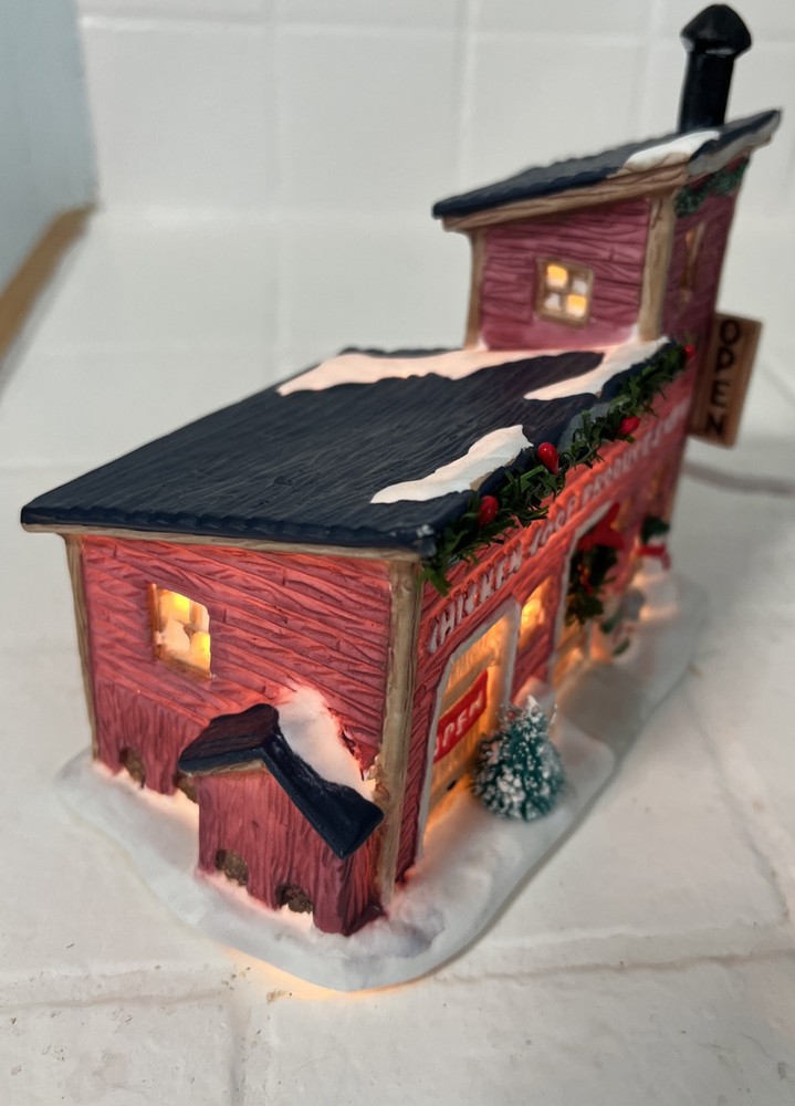 The Christmas Village Chicken Coop Produce & Gifts Building is a limited edition collectible piece from 1994. This building is part of a Christmas village collection and features a charming chicken coop where produce and gifts are sold. The design captures the festive spirit of the holiday season and adds a cozy touch to any holiday display. Perfect for collectors or those looking to create a whimsical Christmas village scene, this limited edition building is a unique and special addition to any holiday decor.