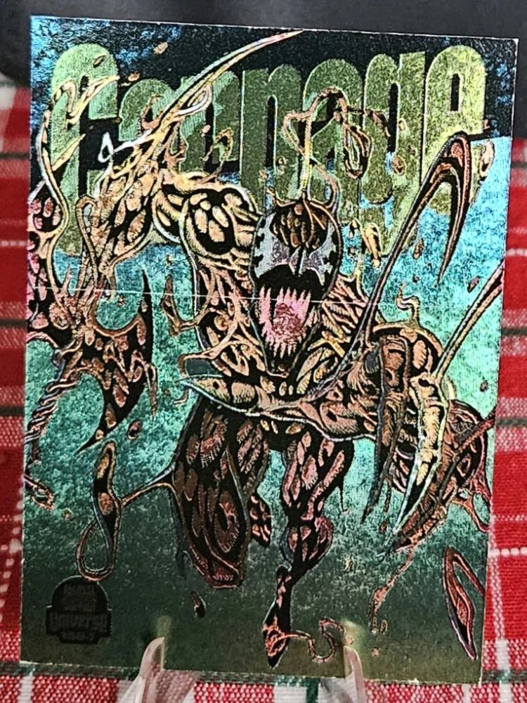 This 1994 Marvel Universe trading card set features two of the most infamous Characters in the Marvel universe, Carnage and Gambit. With vibrant rainbow foil designs, these cards are a must-have for any collector or fan of the superhero genre. Manufactured by Fleer, this set is a great addition to any collection and is sure to impress. The set includes two cards, both featuring the iconic villains in action. The cards are from the non-sport trading card genre and are a part of the Marvel Cinematic Universe franchise. Released in 1994, this set is a great representation of the superhero genre and is sure to impress any collector. Add this set to your collection today!