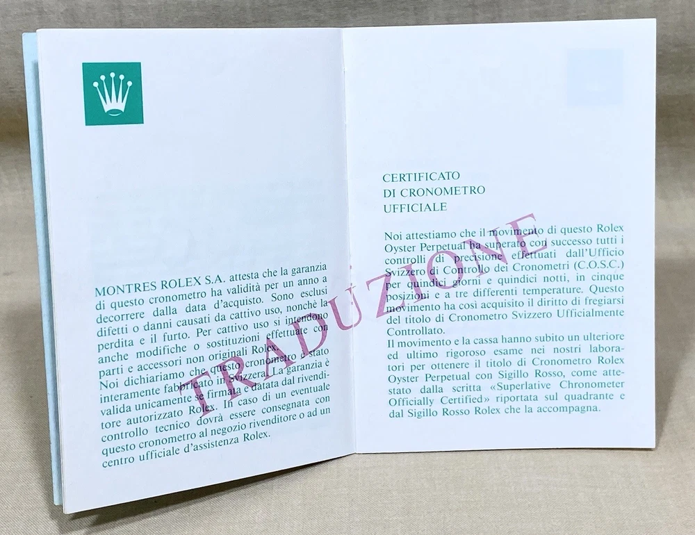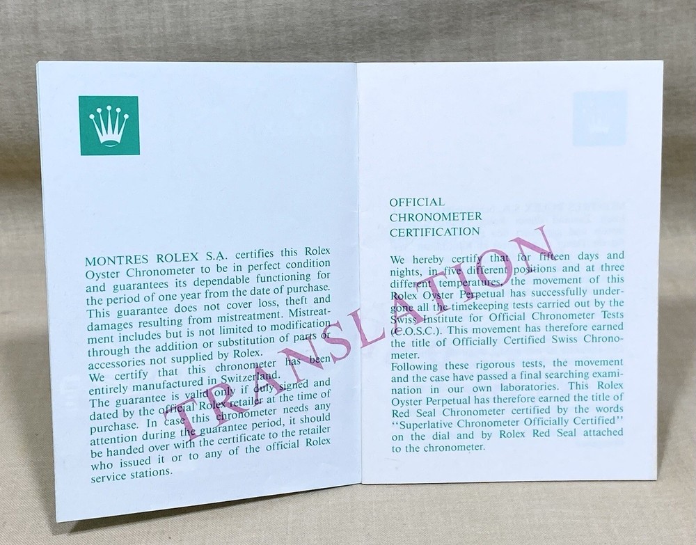 Rolex Genuine Booklet Translation Languages: English, German, Italian, Portuguese, Spanish, Danish, Dutch, Russian, Japanese*, Chinese*, Arabic* (Languages with *: I am not sure if these are the correct languages, I can send pictures if requested) Vintage Ref: 565.00.250.10.94 Please Note: Item is slightly marked (see photos) Private Collection ORIGINAL ---------------------------------------------- These products are being sold for Collection purposes ONLY. I am Member of WTA since 1998 I am not affiliated with Rolex . I am not an official Rolex Dealer Questions : Please ask us all the questions you have before bidding. ------------------------------------------------- We sell products that might have been used or otherwise known as "take-offs". Some parts are like new or very gently used, and others show signs of wear and may need to be cleaned or polished. Please see pictures for more details. We try to take pictures of any defects the item may have. If you have any additional questions, feel free to ask us and we will get back to you as soon as possible. Customer Service If for any reason you have an issue with our product, please choose “Contact Seller” via eBay before leaving negative feedback or opening a case. We promise to resolve any issues as soon as possible. Positive feedback and 5-star seller ratings are extremely important to us as we are looking to provide outstanding products and services to our customers. Returns We reserve the right to charge a 10% restocking fee on all returns. Shipping and handling charges are not refundable. The buyer is responsible for the return shipping fee. Shipping We typically ship orders Monday through Friday (except for Holidays) within 3 business days of receipt of cleared payment. Please make sure your shipping address is correct before sending payment. All orders are shipped with a tracking number. You will receive and email with it as soon as your order ships. Please allow a few extra days for delivery if there is a weather problem. IMPORTANT NOTE FOR INTERNATIONAL BUYERS All our goods are shipped from Spain, but we are a UK based eBay shop, sales to the European community might be subject to VAT. Please see the link below: VAT on eBay purchases for EU buyers | eBay.com BUYERS OUTSIDE THE EUROPEAN UNION: The tariffs, duties and import taxes are not included in item price or shipping charges. These charges are the responsibility of the buyer. Refer to the customs authorities of your country to inquire about these costs before bidding on an item or buying it. These fees are usually charged by the carrier or when the buyer takes the item and should not be confused with additional shipping costs.