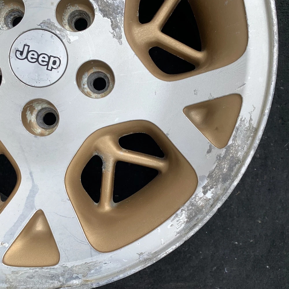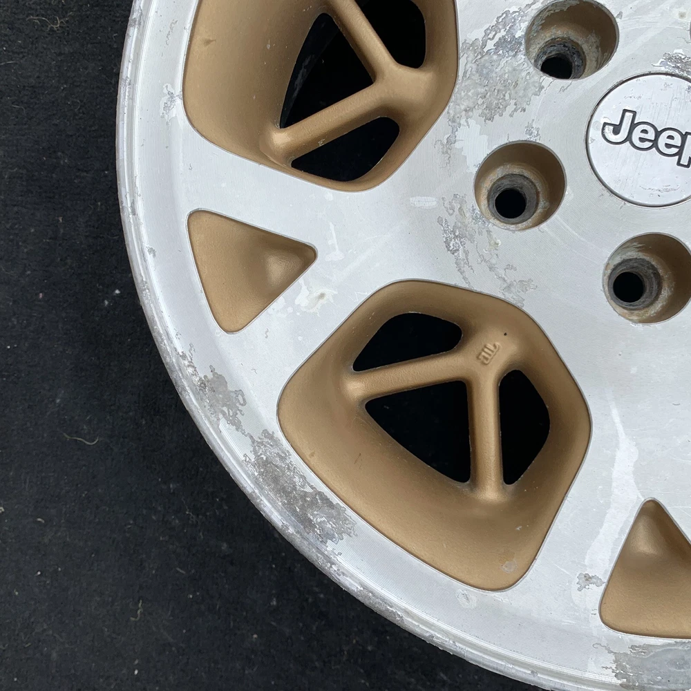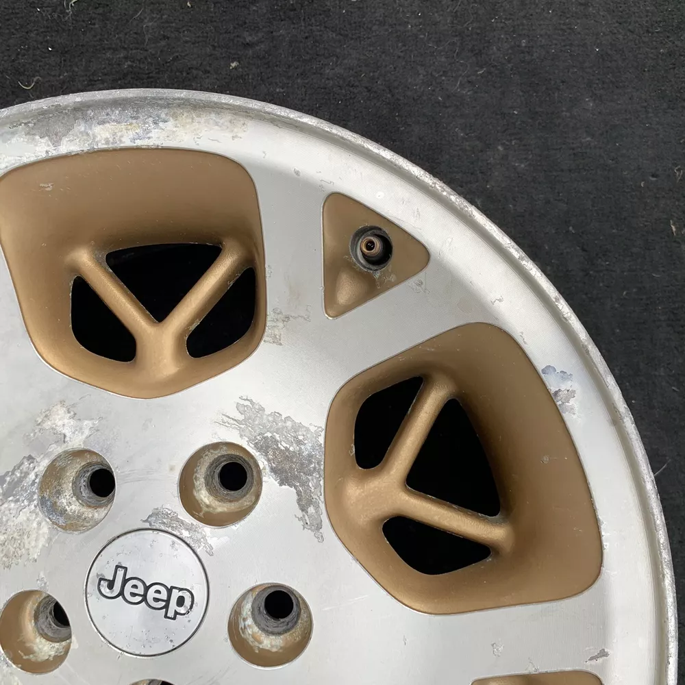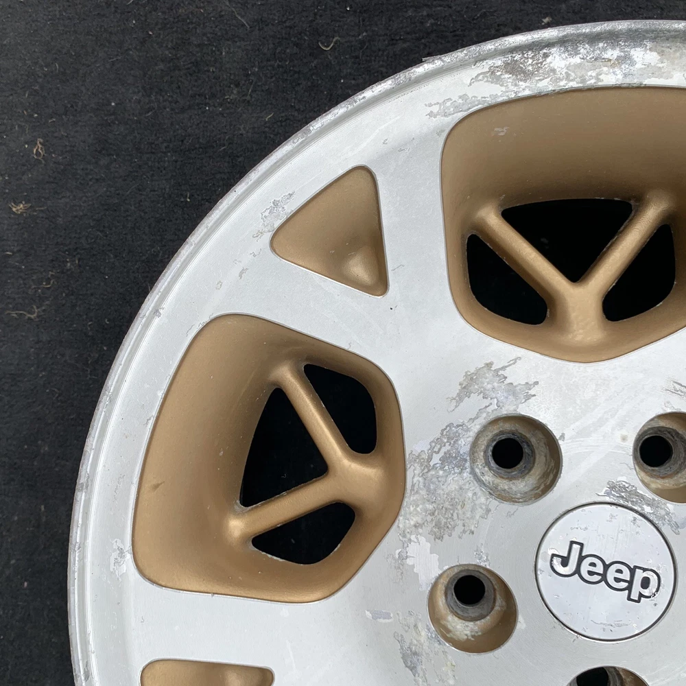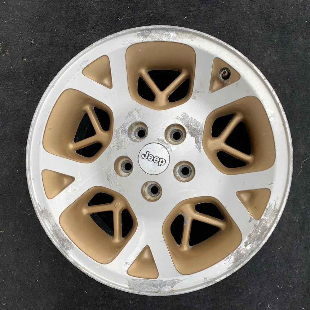 1996 - 1998 JEEP GRAND CHEROKEE 16 INCH MACHINED WITH GOLD INSERTS ALUMINUM WHEEL. 16X7. BOLT PATTERN 5X114.3 PART # 52087868 THIS IS A USED OEM JEEP WHEEL IN COSMETICALLY FAIR BUT GOOD USEABLE CONDITION. THERE IS OXIDATION & SCUFFS. PLEASE SEE PICTURES. THE WHEEL PICTURED IS THE WHEEL YOU WILL RECEIVE. 6 MONTH WARRANTY, 30 DAY RETURN POLICY. FREE SHIPPING WITH UPS GROUND. SAME DAY HANDLING.