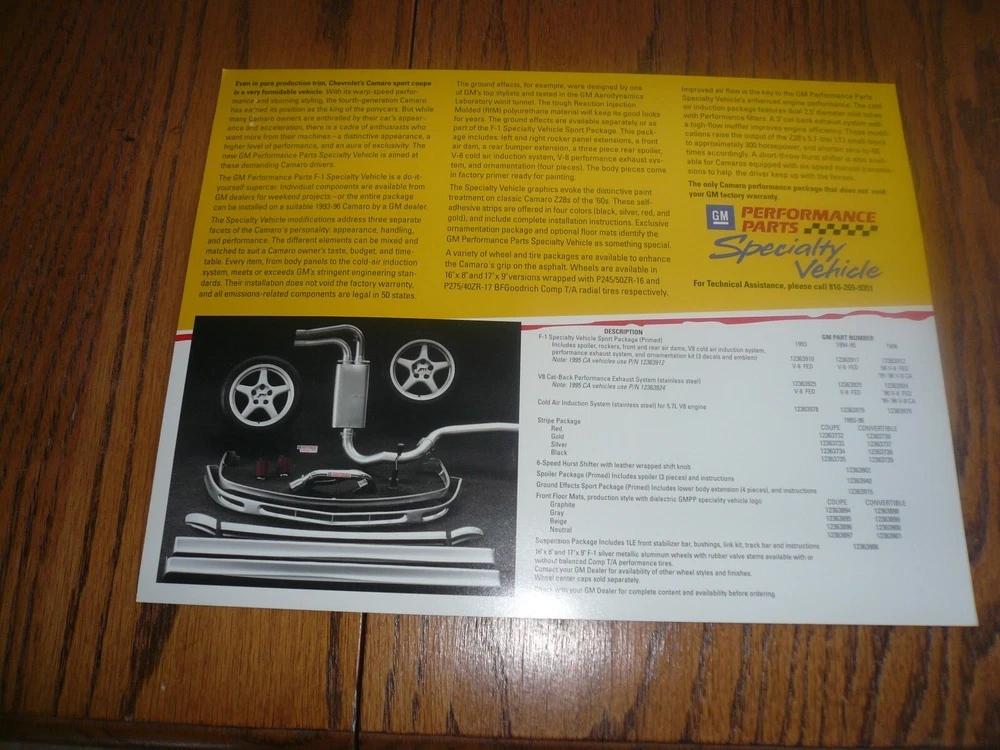 1996 GM Performance Parts Specialty Vehicle F-1 Camaro Advertising Card Vintage Measures 8.5" x 11.0" double sided. Does have staple hole on top right. Garage 2608