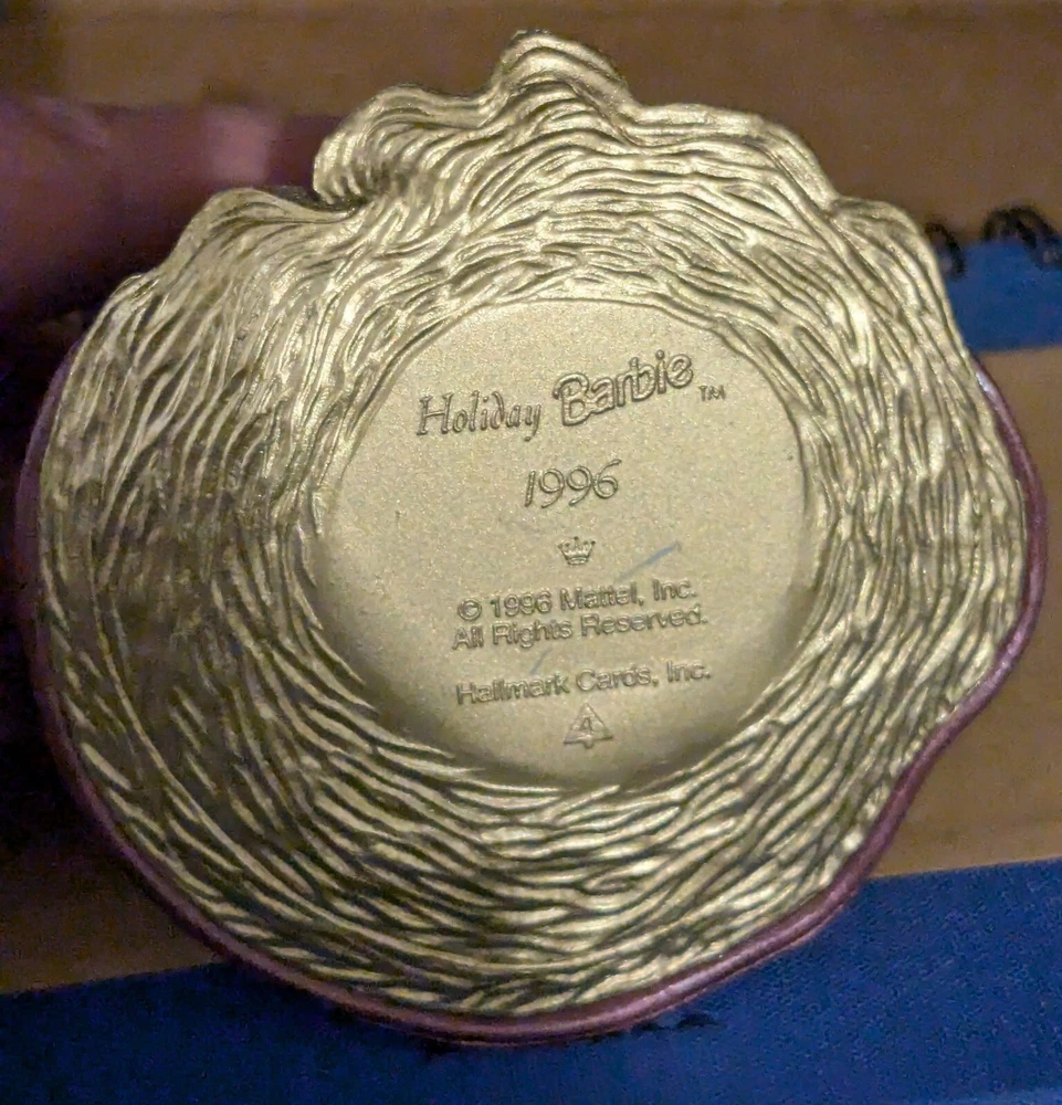 1996 Hallmark Keepsake Ornament: Holiday Barbie Celebrate the splendor of the season with the fourth ornament in the cherished Holiday Barbie Collector’s Series. Barbie is radiant in a gold hoop dress adorned with a rich burgundy coat, cinched at the waist to enhance her timeless elegance. Her accessories—a matching white muff and hat—add a touch of winter charm, perfectly complementing her long, flowing hair. Poised and graceful, this ornament is a dazzling representation of holiday beauty, making it an unforgettable addition to your festive décor or cherished collection.