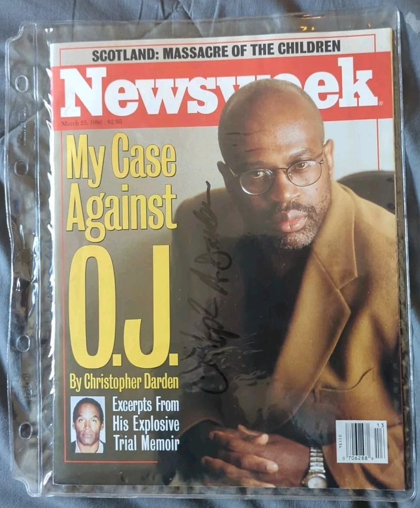 This Newsweek magazine from March 25, 1996 features a captivating story about the O.J. Simpson trial, with a stunning front cover photo of Christopher Darden. The magazine is signed by Darden himself, adding a unique touch to any collection. The publication is in English and was printed in the United States. It is a great addition to any news or drama genre collection, and is sure to be a conversation starter. Don't miss out on this rare opportunity to own a piece of history.