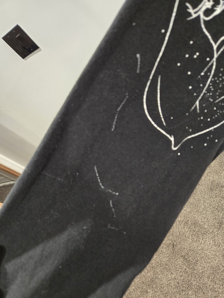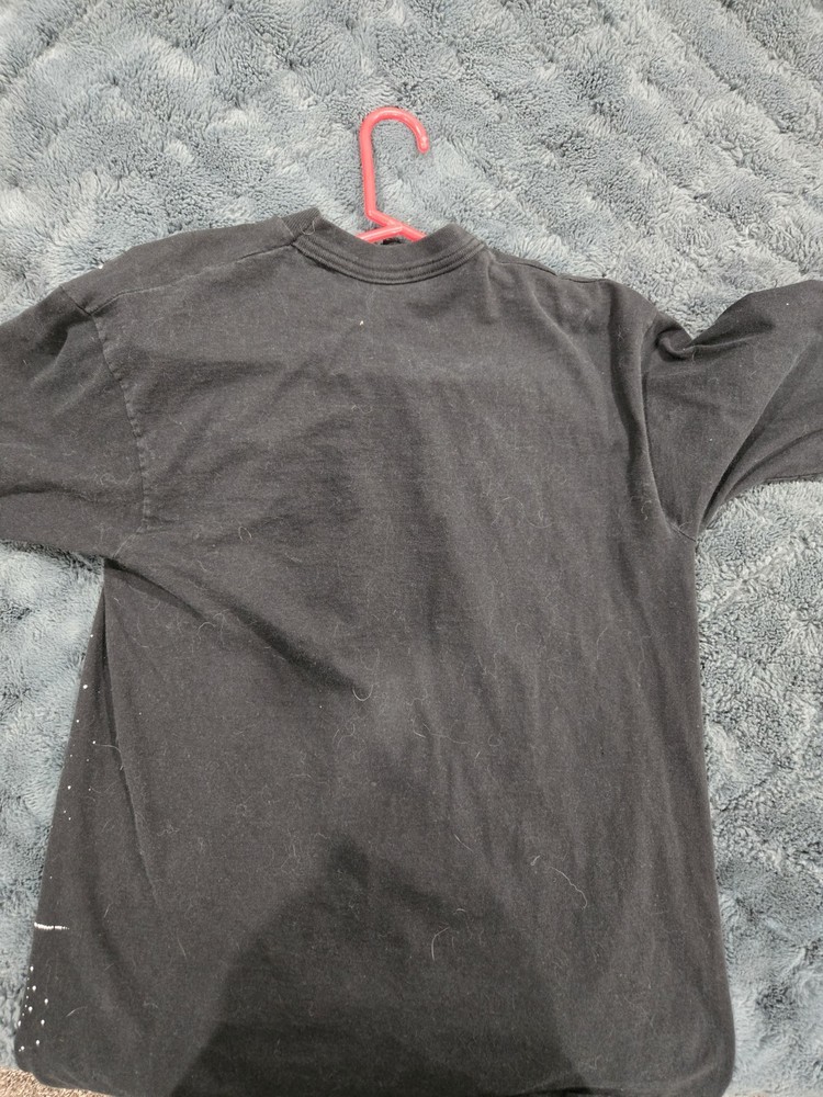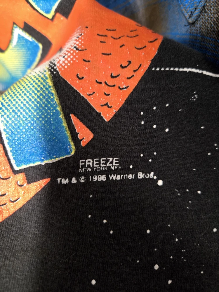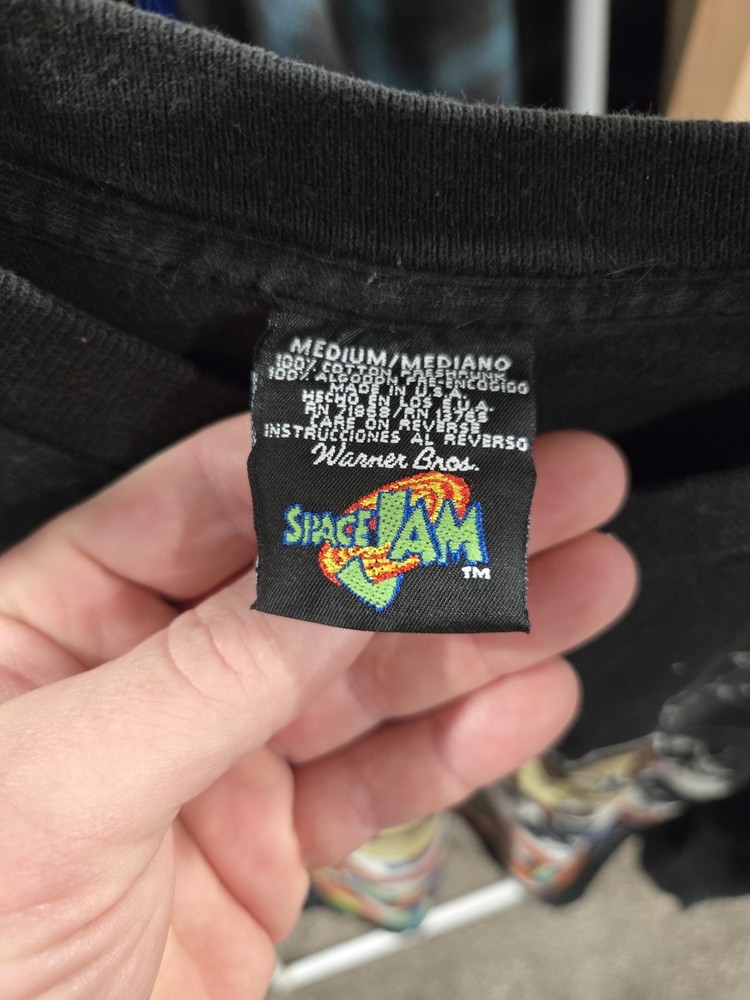 The 1996 Space Jam Long Sleeve Shirt is a vintage piece from the 1990s, featuring a black color with a grunge look. Made of cotton, this original Warner Bros brand shirt is a graphic tee with a single stitch and some stain on one sleeve. The shirt is in size M. With a United States country of manufacture, this shirt is a unique addition to any vintage clothing collection.