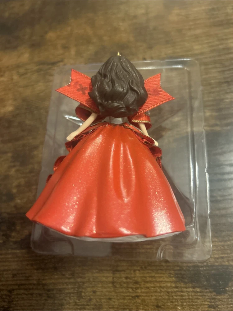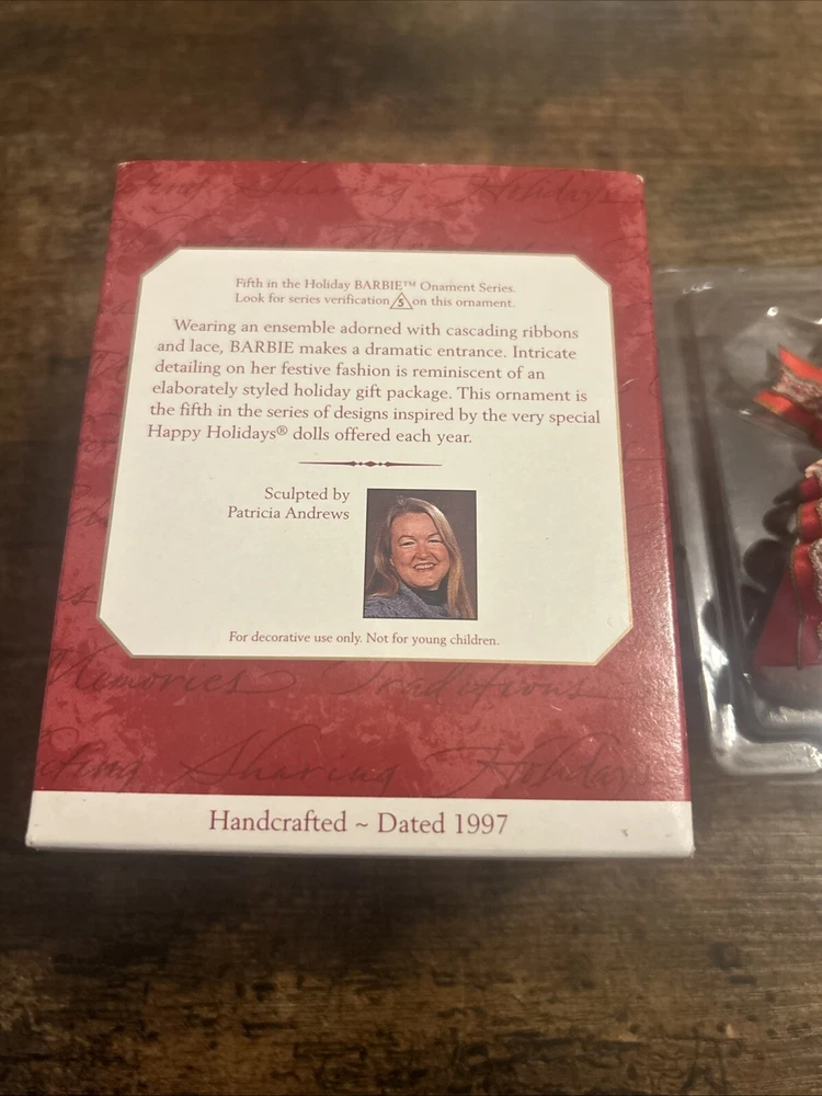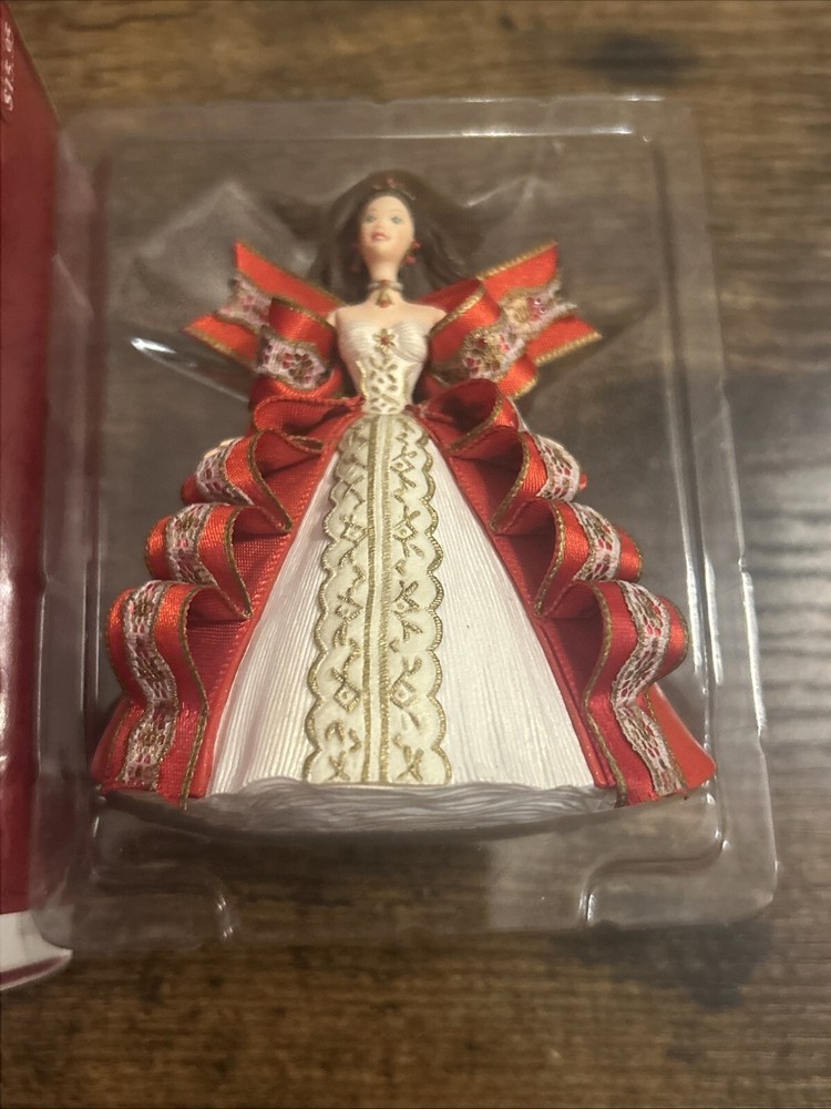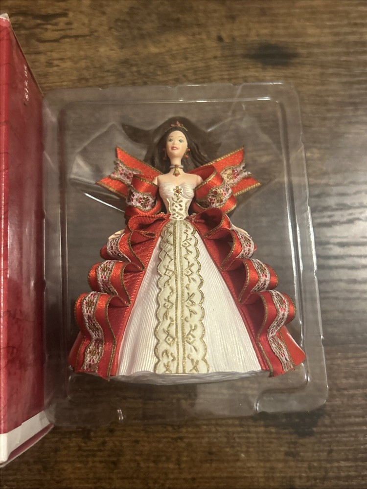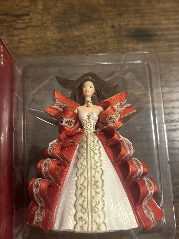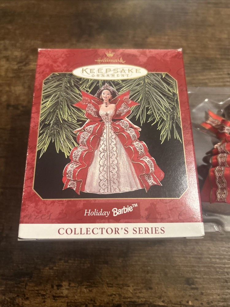 The 1997 Holiday Barbie in Red Dress Hallmark Keepsake Ornament is a vintage collectible from the Barbie franchise. This ornament features a Holiday Barbie dressed in a red outfit, perfect for Christmas decorating. Made of mixed materials and plastic, it is a part of the Collector's Series by Hallmark. The ornament is designed for hanging and decoration, making it a festive addition to any holiday display.