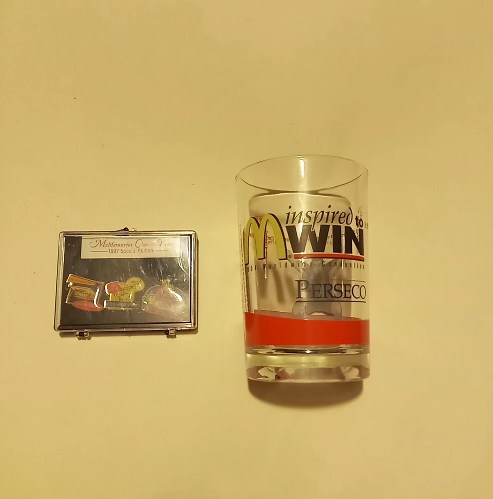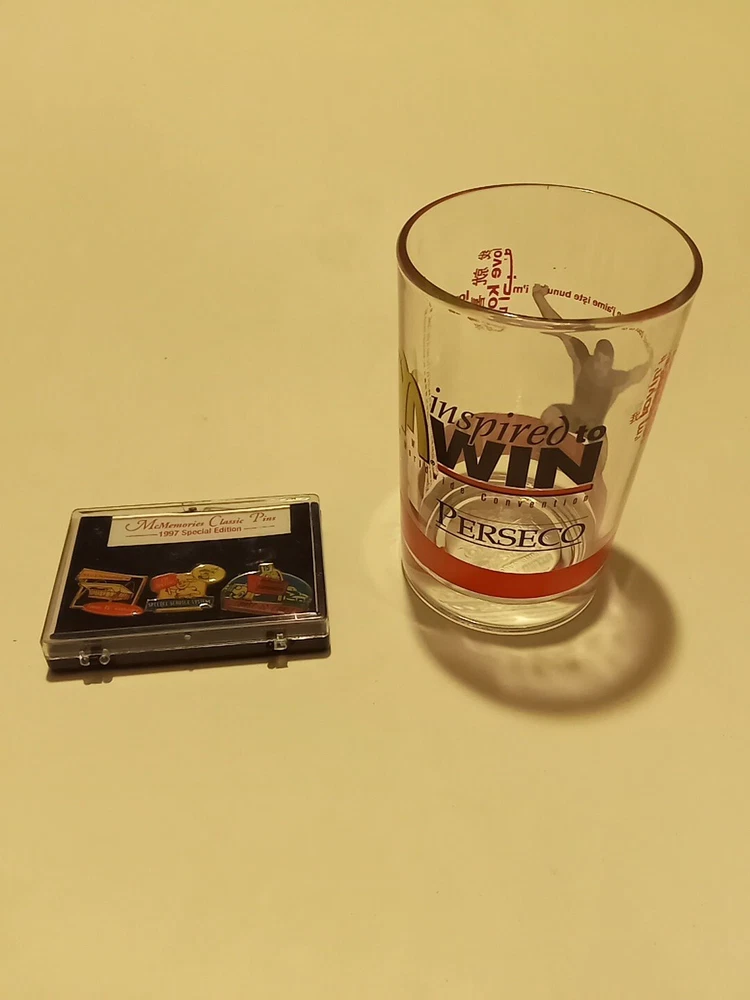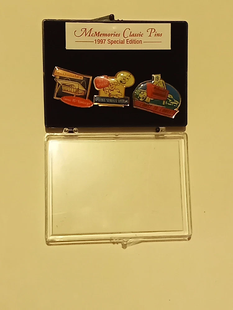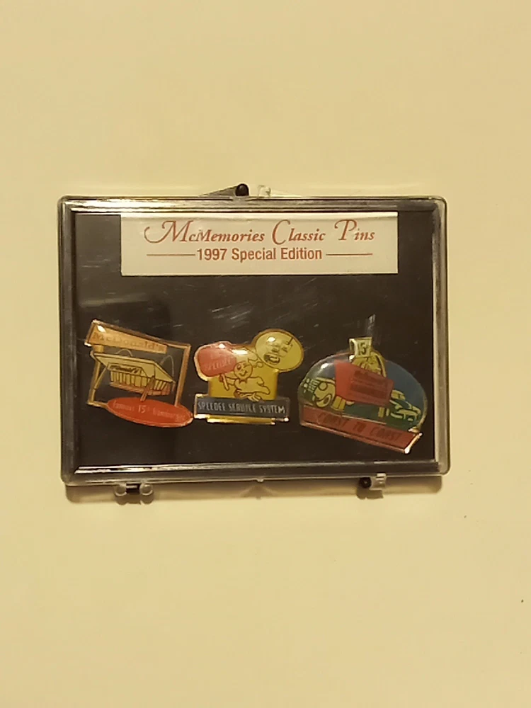 This set of 3 McMemories Classic Pins from 1997 and a Convention Glass from 2004 are perfect for any McDonald's enthusiast. The pins feature the iconic McDonald's logo and the glass showcases the fun and playful design of the 2004 convention theme. These items are sure to add a touch of nostalgia to any collection. Don't let this opportunity slip away. The pin case has one tab broke off back. (See Photos) Thank you for looking.