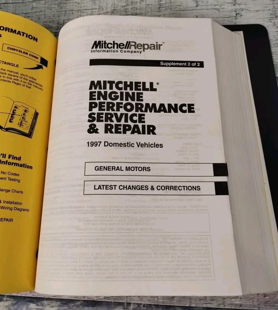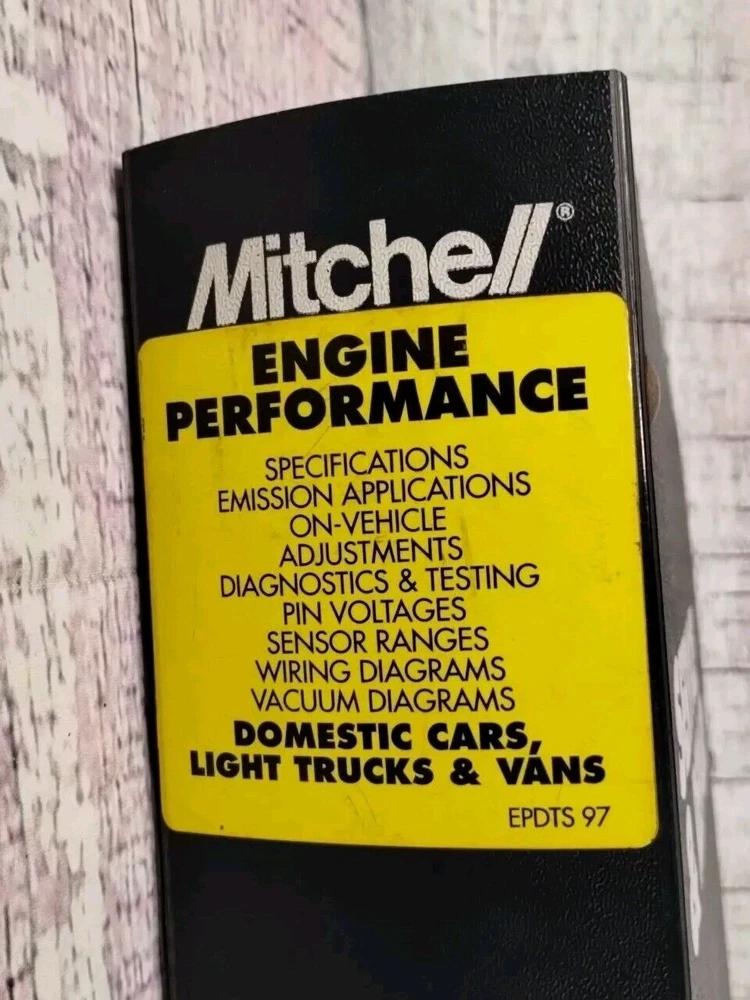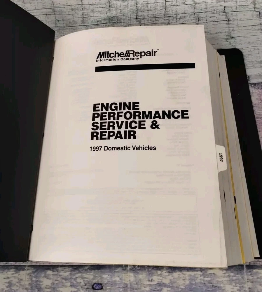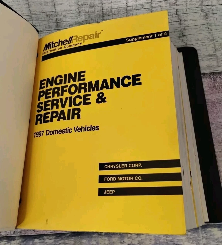 Mitchell Engine Performance Service Repair Manual Domestic Cars, Light Trucks & Vans Chrysler, Ford, GM, Jeep 1997 The book measures 11 1/2" long by 9 3/4" wide and about 3 3/4" thick This is in good condition but shows some wear from normal use. There are some scratches on the front and back of the binder as shown. Please look at all the pictures for more details. Questions please message me.