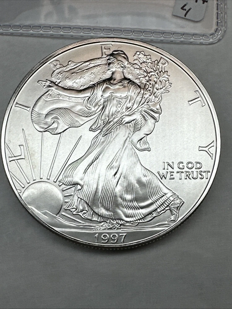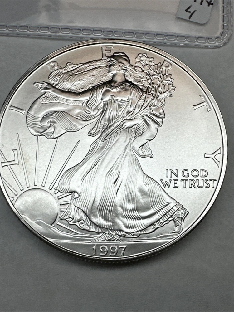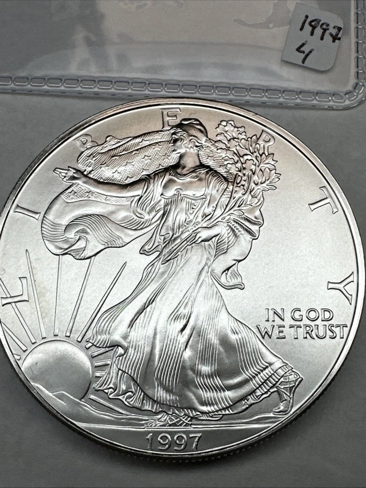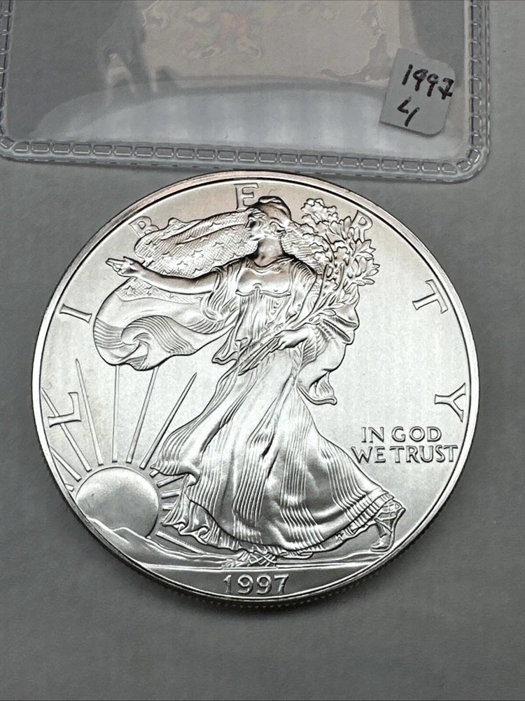 Strike Type: Business Composition: Silver Certification: Uncertified Total Precious Metal Content: 1 oz Country/Region of Manufacture: United States Year: 1997 Precious Metal Content per Unit: 1 oz Grade: Ungraded Coin: American Eagle Fineness: 0.999 Brand/Mint: U.S. Mint