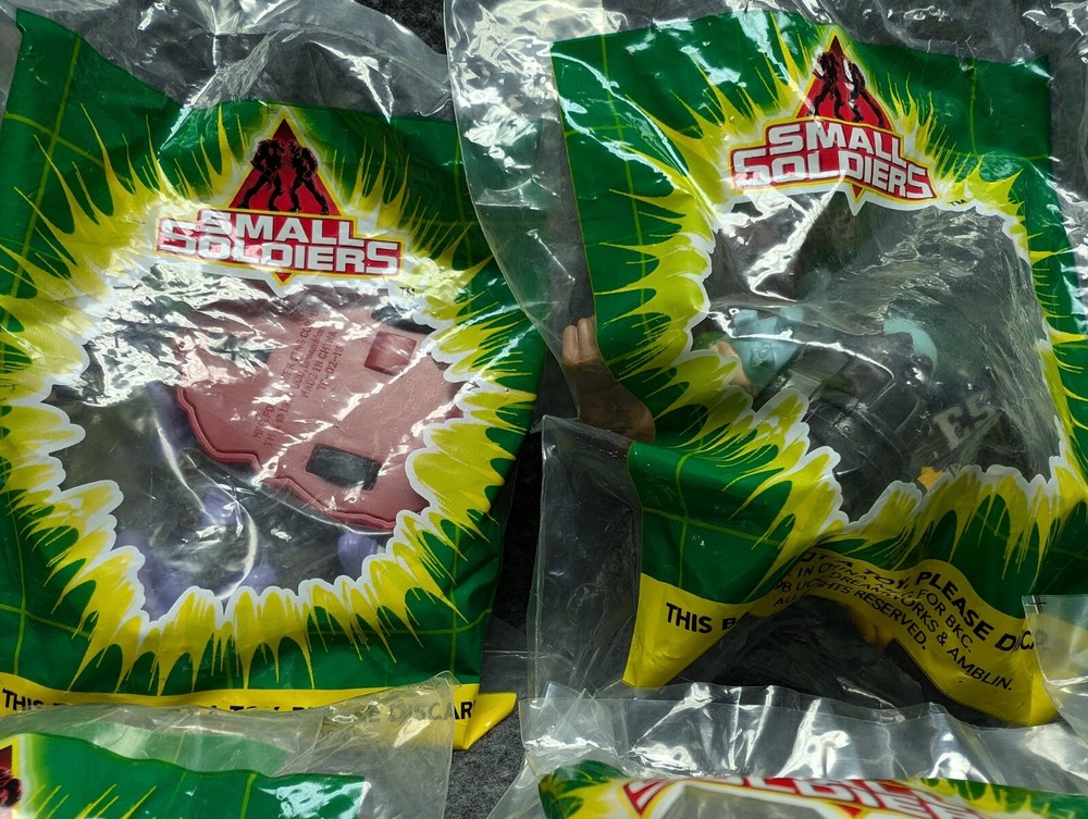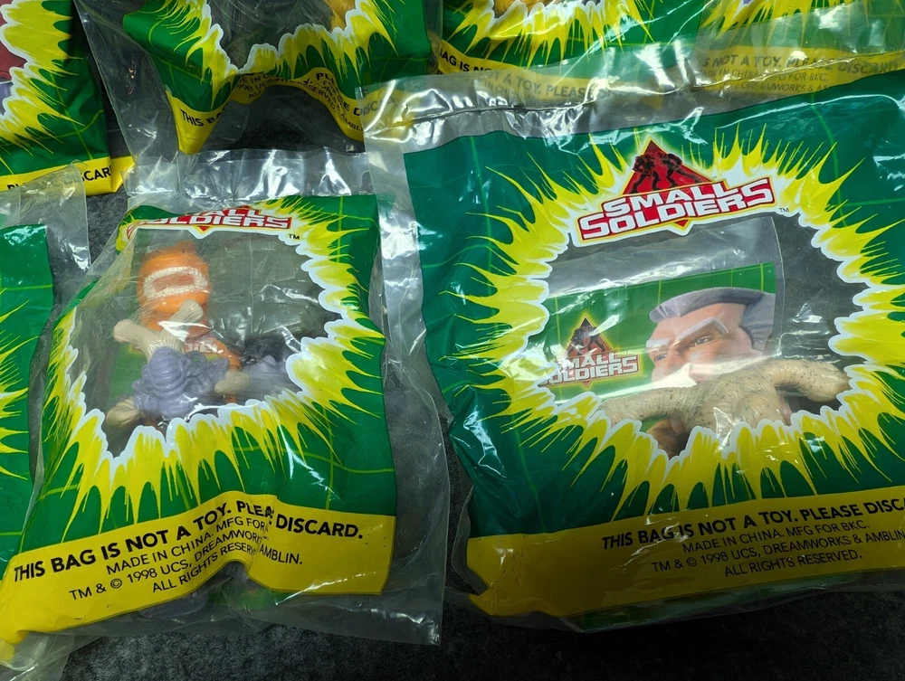 The 1998 Small Soldiers Burger King Kids Toys consist of a set of 10 toys, with 5 representing the commando faction and the other 5 representing the gorgonites faction from the "Small Soldiers" character family. These toys were part of a promotional campaign by Burger King during that year. The toys would have been designed to appeal to children and fans of the Small Soldiers franchise, providing them with collectible items to enjoy.