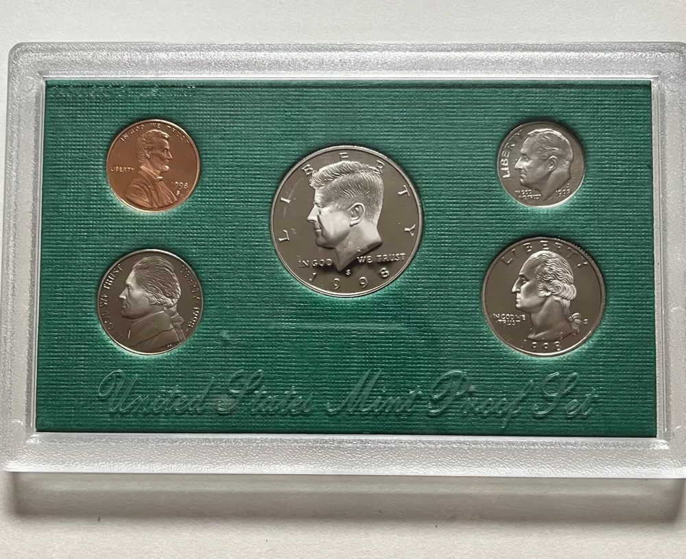 This 1998 Clad Proof Set from the U.S. Mint is a must-have for any serious collector. The set includes five 1C, five 5C, ten 10C, twenty-five 25C, and fifty 50C coins in proof quality. The coins are made of copper-plated zinc and copper-nickel, and were struck in San Francisco.The set comes in its original government packaging with an OGP COA, ensuring its authenticity and quality. This is a rare opportunity to own a piece of American history, and it is perfect for display or as an addition to any collection. Don't miss out on this opportunity to own a stunning piece of proof coinage.