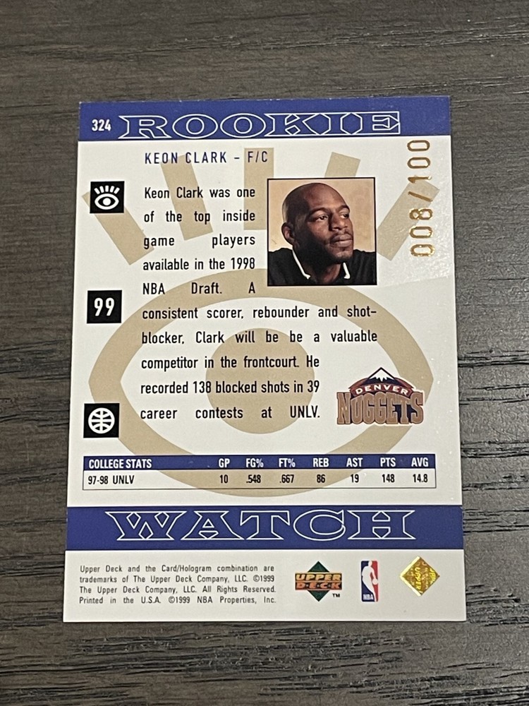 1998-99 Upper Deck Bronze Keon Clark RC #324 Denver Nuggets /100 You are bidding on the exact Cards in the photo. Please take a look at the photos to determine the condition of the Cards for yourself. Near Mint Please check out my eBay store for more items: Save on shipping with multiple items are either purchased or won! Combined shipping available when multiple items are purchased in a single transaction. Combined shipping is calculated as the highest shipping cost + $1 per additional item. When purchasing multiple items, please place all items in cart before paying. When purchasing multiple auction items please wait until final invoice is sent. If you have a question, please send me a message. Thanks for looking!!!
