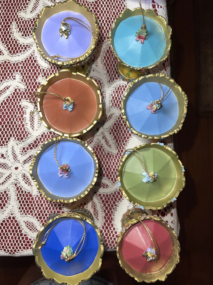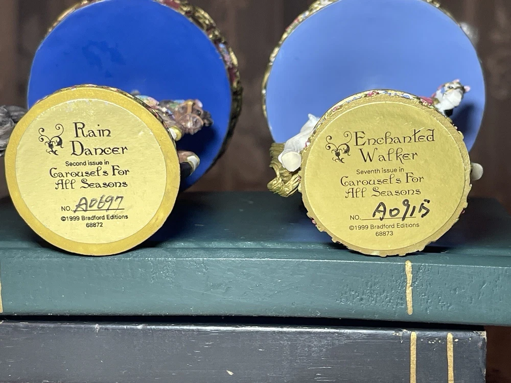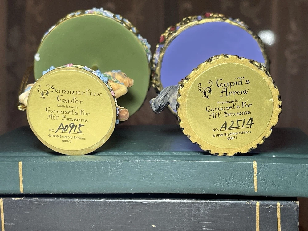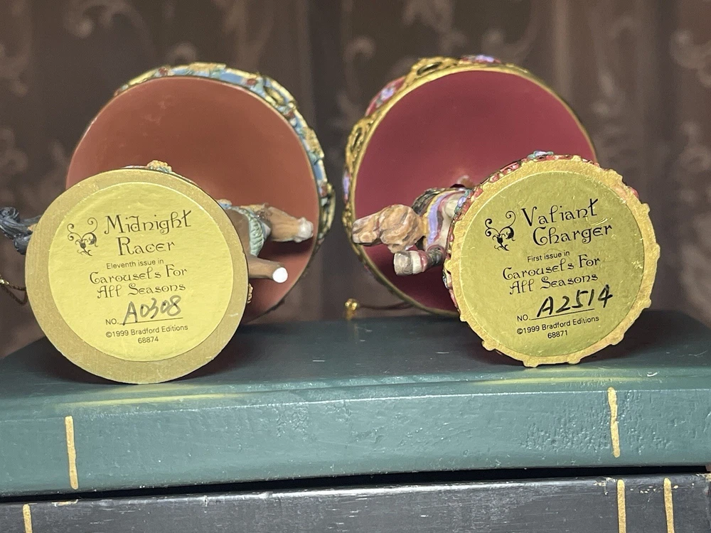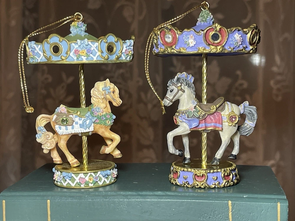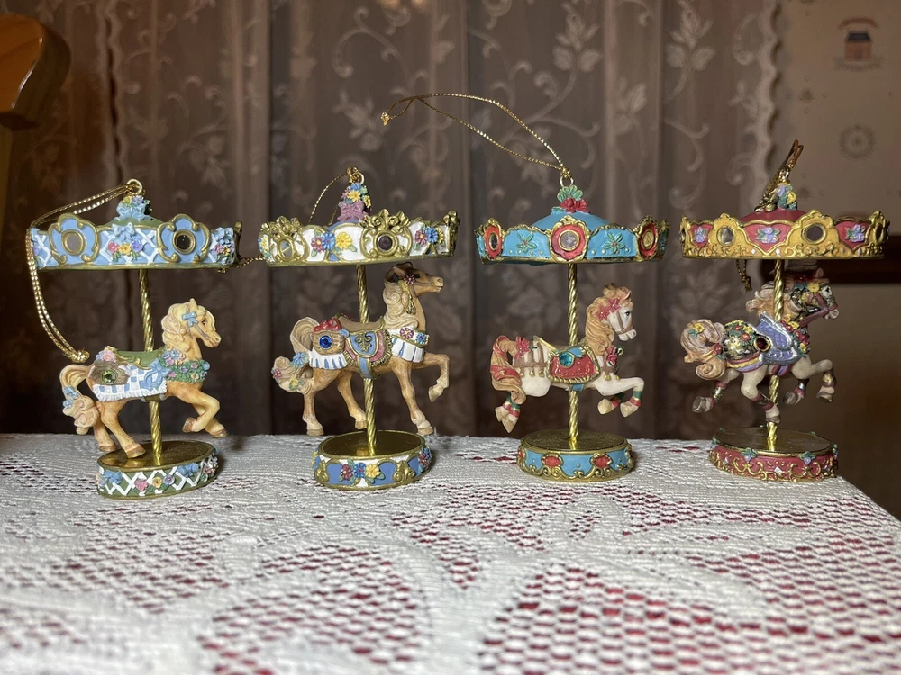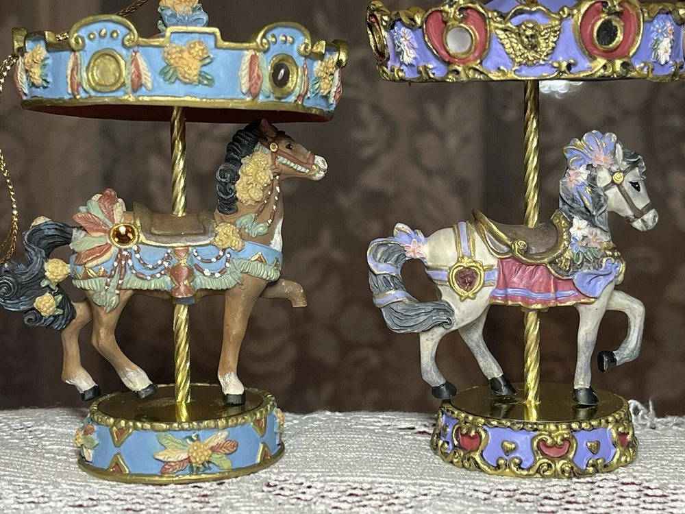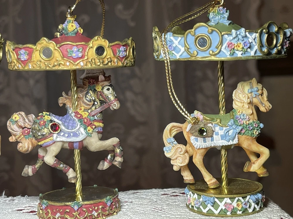 Enhance your holiday decorations with this beautiful set of 8 Bradford Edition Carousel Horse Ornaments. Crafted with exquisite details, these multicolored ornaments are perfect for any collector or horse lover. Each ornament portrays a different horse, representing a season or holiday, making them a great addition to your Christmas tree or year-round decor. The set includes a variety of horses from the Bradford Exchange, all manufactured in 1999. Don't miss out on this unique collection of carousel horse ornaments. Stones are intact on each side of horse except for one side, light green stone, on Summertime Cantor. I have relisted them and lowered the price because 4 of the 8 have repairs in the resin pictured and one with missing lower leg, can’t really tell on a tree but priced accordingly. These are really detailed and beautiful! Need a new home that would appreciate them.