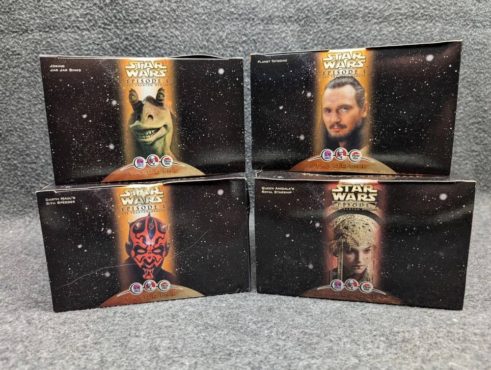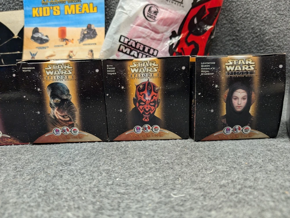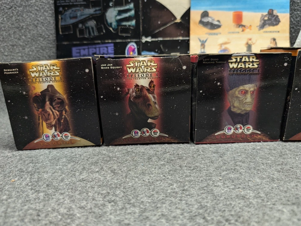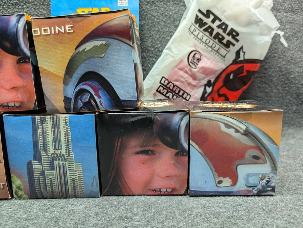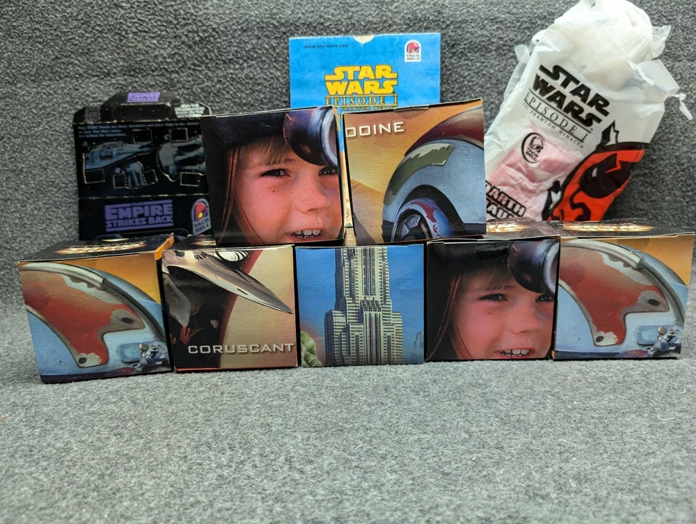 The product is a set of 11 Star Wars Episode I toys that were included in Kids Meals at Taco Bell, KFC, and Pizza Hut in 1999. The toys are associated with the Star Wars character family and were likely part of a promotional campaign tied to the release of the movie. These toys were likely manufactured in China for distribution in the United States, where Taco Bell, KFC, and Pizza Hut are popular fast food chains. The set would be a collectible item for fans of Star Wars memorabilia and fast food promotional items. The set includes 7 toys in 2 x 2 boxes and 4 toys in 4 x 6 boxes. The boxes have never been opened with the exception of the two that I took pictures of. Also included is one kids meal paper bag, Empire strikes Back kids meal box and a plastic to-go bag with Darth Vader's picture on the side.