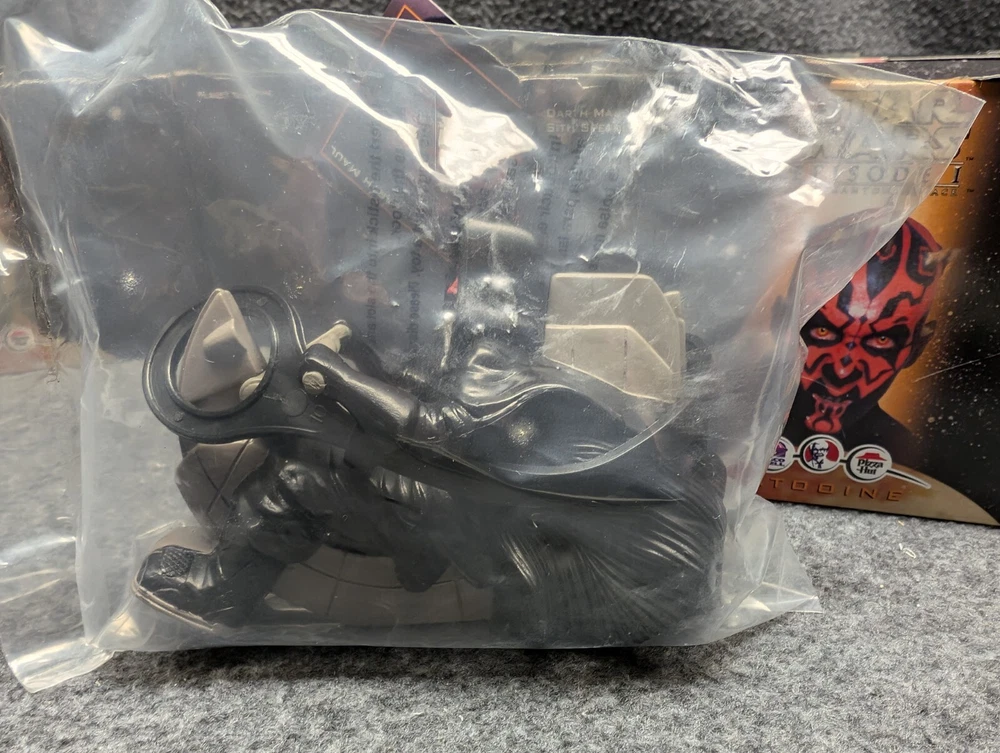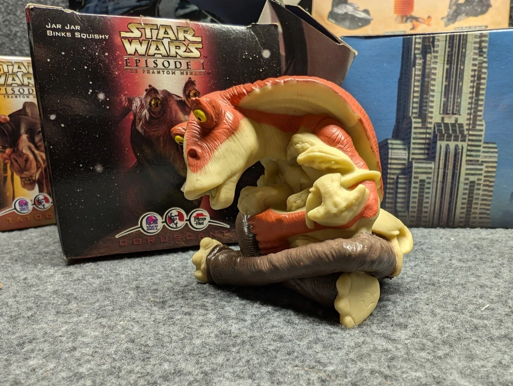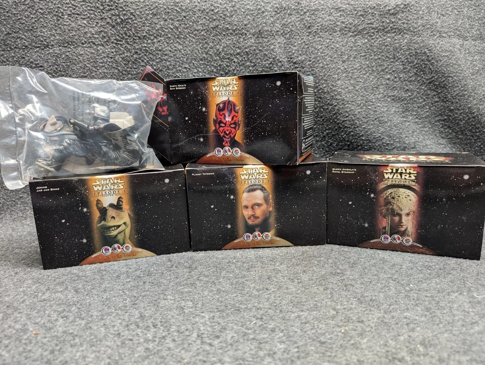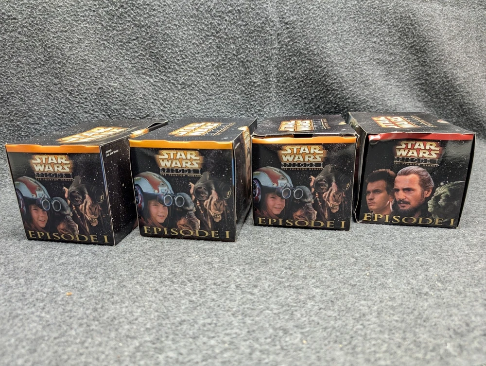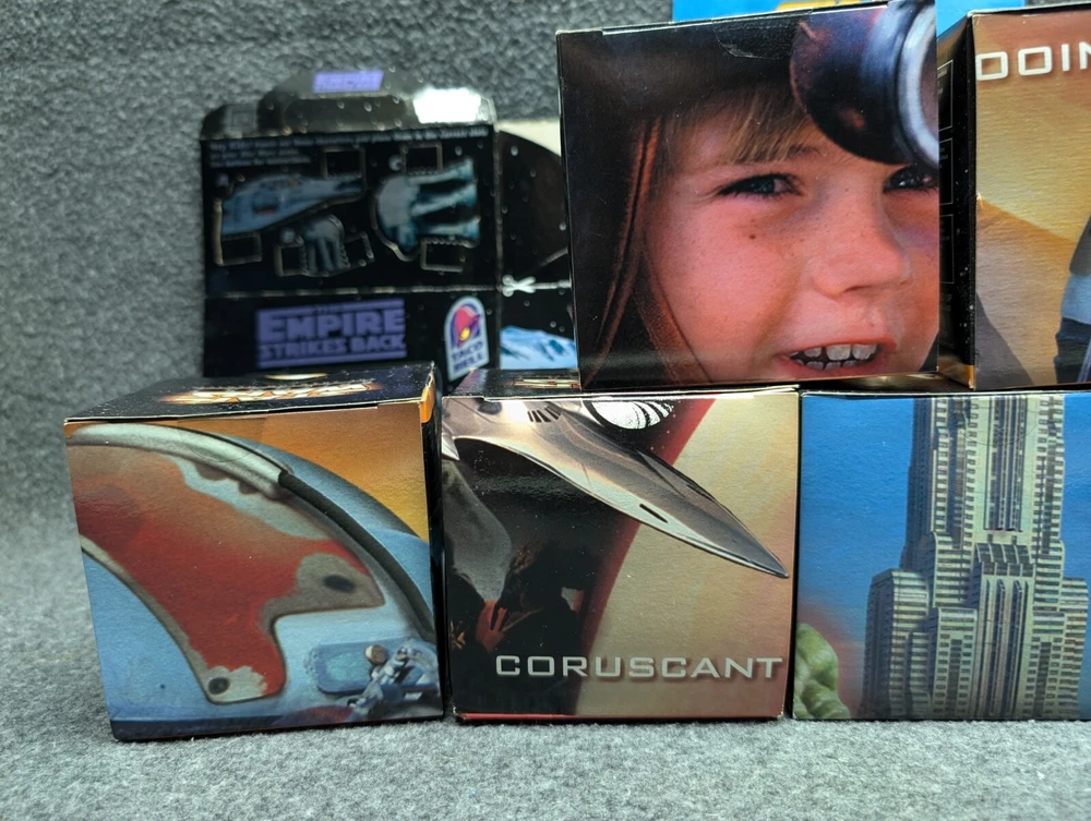 The product is a set of 11 Star Wars Episode I toys that were included in Kids Meals at Taco Bell, KFC, and Pizza Hut in 1999. The toys are associated with the Star Wars character family and were likely part of a promotional campaign tied to the release of the movie. These toys were likely manufactured in China for distribution in the United States, where Taco Bell, KFC, and Pizza Hut are popular fast food chains. The set would be a collectible item for fans of Star Wars memorabilia and fast food promotional items. The set includes 7 toys in 2 x 2 boxes and 4 toys in 4 x 6 boxes. The boxes have never been opened with the exception of the two that I took pictures of. Also included is one kids meal paper bag, Empire strikes Back kids meal box and a plastic to-go bag with Darth Vader's picture on the side.