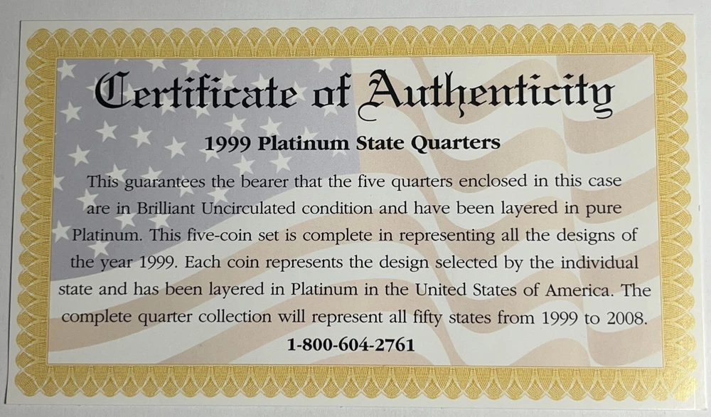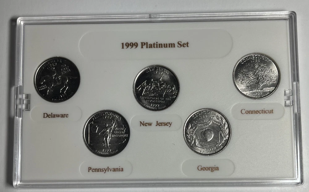 This 1999 State Quarter Collection is a rare find for any coin collector. The set includes five coins, each representing a different state: Connecticut, Georgia, Delaware, New Jersey, and Pennsylvania. Not only are these coins unique in their design, but they also come with a Certificate of Authenticity, ensuring their validity. Minted in Philadelphia, these coins were produced in the United States, adding to their collectible value. Don't miss out on the opportunity to own this stunning set of State Quarters. We Will Ship Within One Business Day Monday-Friday, Upon Cleared Payment. We will combine and discount shipping, when possible, on multiple orders. Please carefully look at photos. Please do your research and due diligence and if you need more photos, to make an informed decision, or if you need any more information, whatsoever, please reach out! Have a wonderful Day!