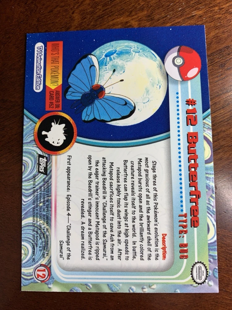 1999 Topps Pokemon TV Animation Black Logo #12 Butterfree Up for sale is a 1999 Topps Pokemon TV Series card. Please review pictures as the card pictured is of the actual card that you will receive. The card will be placed in a penny sleeve and shipped in a cardboard box with delivery tracking. I have 100% positive feedback and have been selling items on ebay for many years. Let me know if you have any questions or need additional pictures and I will be happy to provide them. Yes - I do offer combined shipping. Additional shipping cost for each ungraded (raw) card is FREE and for each PSA graded item is only $0.50. Pokémon Official Trading Cards , informally known as Pokémon Trading Cards series 1 , was a set of Pokémon-themed trading cards manufactured by Topps in 1999. There were 90 cards in total: 76 Pokémon cards, 13 character cards, and a checklist card. Each of these 90 cards also had two foil card versions (silver and rainbow) in their main United States distributions. This set contained no bonus "chase cards". In the United States There were four different printings. These cards all had an oval Nintendo seal. The printings are distinguished by a blue, black, green, or red Topps logo, with card texts being updated between the first (blue) and second (black) printings. Due to an error, all foil cards after the first printing were printed with black logos, but can still be distinguished by the differences in their debossings. § 1st printing: blue logo on all cards, foil cards had a smooth texture with no debossings. § 2nd printing: black logo on all cards, Pokémon foil cards were debossed with rays and starbursts, while TV cards had a sandpaper finish. § 3rd printing: green logo on non-foil cards only, Pokémon foil cards were debossed with flames and teardrops, while TV cards had dots and rectangles. § 4th printing: red logo on non-foil cards only, Pokémon foil cards were debossed with Poké Balls and targets, while TV cards had dents. A fifth printing featuring foil cards with a smooth finish but a black logo (features of both the 1st and 2nd printings) was also produced to an uncertain extent. Pokémon Trading Cards series 2 was a set of Pokémon-themed trading cards manufactured by Topps in 2000. There were 72 cards in total: 41 Pokémon cards, 5 "Heroes & Villains" cards, 25 episode cards, and a checklist card. Each of these 72 cards also had two foil card versions (silver and rainbow). In addition, there were 27 bonus "chase cards" not included on the checklist, including 12 die-cut embossed cards, 10 animation stick-on cards, and 5 clear cards. Pokémon Trading Cards series 3 was a set of Pokémon-themed trading cards manufactured by Topps in 2000. There were 72 cards in total: 34 Pokémon cards, 12 "Heroes & Villains" cards, 19 episode cards, 6 puzzle cards, and a checklist card. Each of these 72 cards also had two foil card versions (silver and rainbow). In addition, there were 27 bonus "chase cards" not included on the checklist, including 12 die-cut embossed evolution cards, 10 pop-up cards, and 5 clear cards.