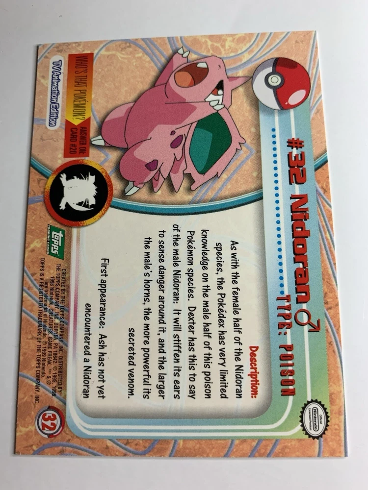1999 Topps Pokemon TV Animation Green Logo #32 Nidoran Up for sale is a 1999 Topps Pokemon TV Series card. Please review pictures as the card pictured is of the actual card that you will receive. The card will be placed in a penny sleeve and shipped in a cardboard box with delivery tracking. I have 100% positive feedback and have been selling items on ebay for many years. Let me know if you have any questions or need additional pictures and I will be happy to provide them. Yes - I do offer combined shipping. Additional shipping cost for each ungraded (raw) card is FREE and for each PSA graded item is only $0.50. Pokémon Official Trading Cards , informally known as Pokémon Trading Cards series 1 , was a set of Pokémon-themed trading cards manufactured by Topps in 1999. There were 90 cards in total: 76 Pokémon cards, 13 character cards, and a checklist card. Each of these 90 cards also had two foil card versions (silver and rainbow) in their main United States distributions. This set contained no bonus "chase cards". In the United States There were four different printings. These cards all had an oval Nintendo seal. The printings are distinguished by a blue, black, green, or red Topps logo, with card texts being updated between the first (blue) and second (black) printings. Due to an error, all foil cards after the first printing were printed with black logos, but can still be distinguished by the differences in their debossings. § 1st printing: blue logo on all cards, foil cards had a smooth texture with no debossings. § 2nd printing: black logo on all cards, Pokémon foil cards were debossed with rays and starbursts, while TV cards had a sandpaper finish. § 3rd printing: green logo on non-foil cards only, Pokémon foil cards were debossed with flames and teardrops, while TV cards had dots and rectangles. § 4th printing: red logo on non-foil cards only, Pokémon foil cards were debossed with Poké Balls and targets, while TV cards had dents. A fifth printing featuring foil cards with a smooth finish but a black logo (features of both the 1st and 2nd printings) was also produced to an uncertain extent. Pokémon Trading Cards series 2 was a set of Pokémon-themed trading cards manufactured by Topps in 2000. There were 72 cards in total: 41 Pokémon cards, 5 "Heroes & Villains" cards, 25 episode cards, and a checklist card. Each of these 72 cards also had two foil card versions (silver and rainbow). In addition, there were 27 bonus "chase cards" not included on the checklist, including 12 die-cut embossed cards, 10 animation stick-on cards, and 5 clear cards. Pokémon Trading Cards series 3 was a set of Pokémon-themed trading cards manufactured by Topps in 2000. There were 72 cards in total: 34 Pokémon cards, 12 "Heroes & Villains" cards, 19 episode cards, 6 puzzle cards, and a checklist card. Each of these 72 cards also had two foil card versions (silver and rainbow). In addition, there were 27 bonus "chase cards" not included on the checklist, including 12 die-cut embossed evolution cards, 10 pop-up cards, and 5 clear cards.