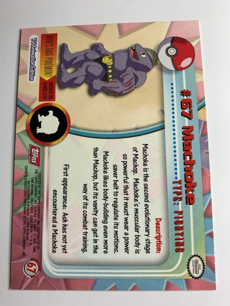 1999 Topps Pokemon TV Animation Red Logo #67 Machoke Up for sale is a 1999 Topps Pokemon TV Series card. Please review pictures as the card pictured is of the actual card that you will receive. The card will be placed in a penny sleeve and shipped in a cardboard box with delivery tracking. I have 100% positive feedback and have been selling items on ebay for many years. Let me know if you have any questions or need additional pictures and I will be happy to provide them. Yes - I do offer combined shipping. Additional shipping cost for each ungraded (raw) card is FREE and for each PSA graded item is only $0.50. Pokémon Official Trading Cards , informally known as Pokémon Trading Cards series 1 , was a set of Pokémon-themed trading cards manufactured by Topps in 1999. There were 90 cards in total: 76 Pokémon cards, 13 character cards, and a checklist card. Each of these 90 cards also had two foil card versions (silver and rainbow) in their main United States distributions. This set contained no bonus "chase cards". In the United States There were four different printings. These cards all had an oval Nintendo seal. The printings are distinguished by a blue, black, green, or red Topps logo, with card texts being updated between the first (blue) and second (black) printings. Due to an error, all foil cards after the first printing were printed with black logos, but can still be distinguished by the differences in their debossings. § 1st printing: blue logo on all cards, foil cards had a smooth texture with no debossings. § 2nd printing: black logo on all cards, Pokémon foil cards were debossed with rays and starbursts, while TV cards had a sandpaper finish. § 3rd printing: green logo on non-foil cards only, Pokémon foil cards were debossed with flames and teardrops, while TV cards had dots and rectangles. § 4th printing: red logo on non-foil cards only, Pokémon foil cards were debossed with Poké Balls and targets, while TV cards had dents. A fifth printing featuring foil cards with a smooth finish but a black logo (features of both the 1st and 2nd printings) was also produced to an uncertain extent. Pokémon Trading Cards series 2 was a set of Pokémon-themed trading cards manufactured by Topps in 2000. There were 72 cards in total: 41 Pokémon cards, 5 "Heroes & Villains" cards, 25 episode cards, and a checklist card. Each of these 72 cards also had two foil card versions (silver and rainbow). In addition, there were 27 bonus "chase cards" not included on the checklist, including 12 die-cut embossed cards, 10 animation stick-on cards, and 5 clear cards. Pokémon Trading Cards series 3 was a set of Pokémon-themed trading cards manufactured by Topps in 2000. There were 72 cards in total: 34 Pokémon cards, 12 "Heroes & Villains" cards, 19 episode cards, 6 puzzle cards, and a checklist card. Each of these 72 cards also had two foil card versions (silver and rainbow). In addition, there were 27 bonus "chase cards" not included on the checklist, including 12 die-cut embossed evolution cards, 10 pop-up cards, and 5 clear cards.