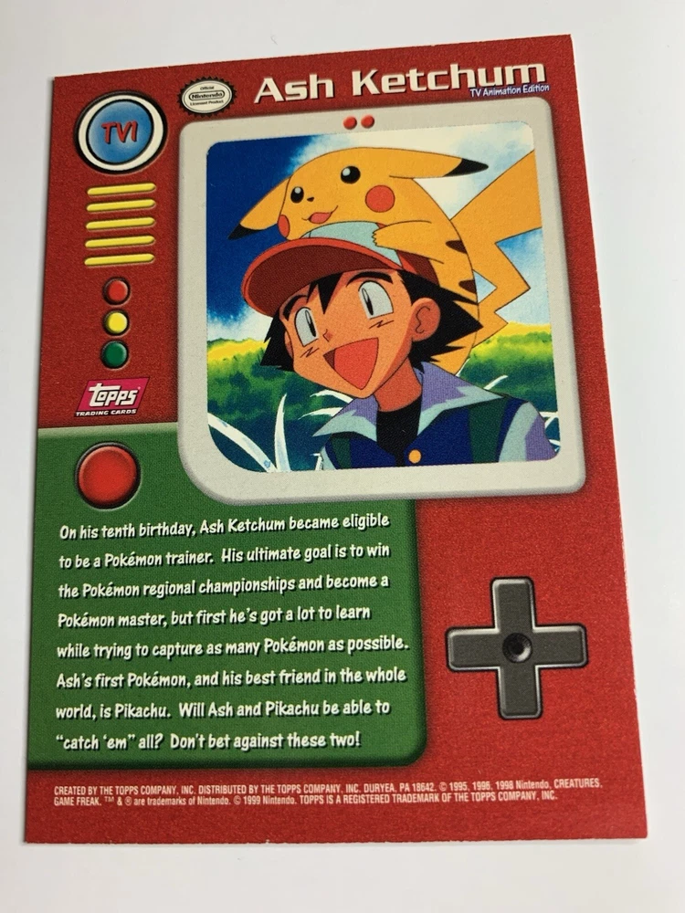 1999 Topps Pokemon TV Animation Red Logo #TV1 Ash Ketchum Up for sale is a 1999 Topps Pokemon TV Series card. Please review pictures as the card pictured is of the actual card that you will receive. The card will be placed in a penny sleeve and shipped in a cardboard box with delivery tracking. I have 100% positive feedback and have been selling items on ebay for many years. Let me know if you have any questions or need additional pictures and I will be happy to provide them. Yes - I do offer combined shipping. Additional shipping cost for each ungraded (raw) card is FREE and for each PSA graded item is only $0.50. Pokémon Official Trading Cards , informally known as Pokémon Trading Cards series 1 , was a set of Pokémon-themed trading cards manufactured by Topps in 1999. There were 90 cards in total: 76 Pokémon cards, 13 character cards, and a checklist card. Each of these 90 cards also had two foil card versions (silver and rainbow) in their main United States distributions. This set contained no bonus "chase cards". In the United States There were four different printings. These cards all had an oval Nintendo seal. The printings are distinguished by a blue, black, green, or red Topps logo, with card texts being updated between the first (blue) and second (black) printings. Due to an error, all foil cards after the first printing were printed with black logos, but can still be distinguished by the differences in their debossings. § 1st printing: blue logo on all cards, foil cards had a smooth texture with no debossings. § 2nd printing: black logo on all cards, Pokémon foil cards were debossed with rays and starbursts, while TV cards had a sandpaper finish. § 3rd printing: green logo on non-foil cards only, Pokémon foil cards were debossed with flames and teardrops, while TV cards had dots and rectangles. § 4th printing: red logo on non-foil cards only, Pokémon foil cards were debossed with Poké Balls and targets, while TV cards had dents. A fifth printing featuring foil cards with a smooth finish but a black logo (features of both the 1st and 2nd printings) was also produced to an uncertain extent. Pokémon Trading Cards series 2 was a set of Pokémon-themed trading cards manufactured by Topps in 2000. There were 72 cards in total: 41 Pokémon cards, 5 "Heroes & Villains" cards, 25 episode cards, and a checklist card. Each of these 72 cards also had two foil card versions (silver and rainbow). In addition, there were 27 bonus "chase cards" not included on the checklist, including 12 die-cut embossed cards, 10 animation stick-on cards, and 5 clear cards. Pokémon Trading Cards series 3 was a set of Pokémon-themed trading cards manufactured by Topps in 2000. There were 72 cards in total: 34 Pokémon cards, 12 "Heroes & Villains" cards, 19 episode cards, 6 puzzle cards, and a checklist card. Each of these 72 cards also had two foil card versions (silver and rainbow). In addition, there were 27 bonus "chase cards" not included on the checklist, including 12 die-cut embossed evolution cards, 10 pop-up cards, and 5 clear cards.