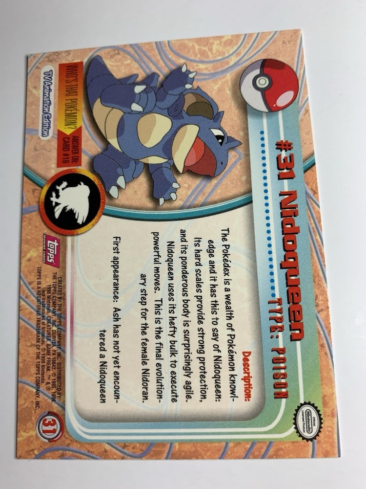 1999 Topps Pokemon TV Animation Red Logo #31 Nidoqueen Up for sale is a 1999 Topps Pokemon TV Series card. Please review pictures as the card pictured is of the actual card that you will receive. The card will be placed in a penny sleeve and shipped in a cardboard box with delivery tracking. I have 100% positive feedback and have been selling items on ebay for many years. Let me know if you have any questions or need additional pictures and I will be happy to provide them. Yes - I do offer combined shipping. Additional shipping cost for each ungraded (raw) card is FREE and for each PSA graded item is only $0.50. Pokémon Official Trading Cards , informally known as Pokémon Trading Cards series 1 , was a set of Pokémon-themed trading cards manufactured by Topps in 1999. There were 90 cards in total: 76 Pokémon cards, 13 character cards, and a checklist card. Each of these 90 cards also had two foil card versions (silver and rainbow) in their main United States distributions. This set contained no bonus "chase cards". In the United States There were four different printings. These cards all had an oval Nintendo seal. The printings are distinguished by a blue, black, green, or red Topps logo, with card texts being updated between the first (blue) and second (black) printings. Due to an error, all foil cards after the first printing were printed with black logos, but can still be distinguished by the differences in their debossings. § 1st printing: blue logo on all cards, foil cards had a smooth texture with no debossings. § 2nd printing: black logo on all cards, Pokémon foil cards were debossed with rays and starbursts, while TV cards had a sandpaper finish. § 3rd printing: green logo on non-foil cards only, Pokémon foil cards were debossed with flames and teardrops, while TV cards had dots and rectangles. § 4th printing: red logo on non-foil cards only, Pokémon foil cards were debossed with Poké Balls and targets, while TV cards had dents. A fifth printing featuring foil cards with a smooth finish but a black logo (features of both the 1st and 2nd printings) was also produced to an uncertain extent. Pokémon Trading Cards series 2 was a set of Pokémon-themed trading cards manufactured by Topps in 2000. There were 72 cards in total: 41 Pokémon cards, 5 "Heroes & Villains" cards, 25 episode cards, and a checklist card. Each of these 72 cards also had two foil card versions (silver and rainbow). In addition, there were 27 bonus "chase cards" not included on the checklist, including 12 die-cut embossed cards, 10 animation stick-on cards, and 5 clear cards. Pokémon Trading Cards series 3 was a set of Pokémon-themed trading cards manufactured by Topps in 2000. There were 72 cards in total: 34 Pokémon cards, 12 "Heroes & Villains" cards, 19 episode cards, 6 puzzle cards, and a checklist card. Each of these 72 cards also had two foil card versions (silver and rainbow). In addition, there were 27 bonus "chase cards" not included on the checklist, including 12 die-cut embossed evolution cards, 10 pop-up cards, and 5 clear cards.