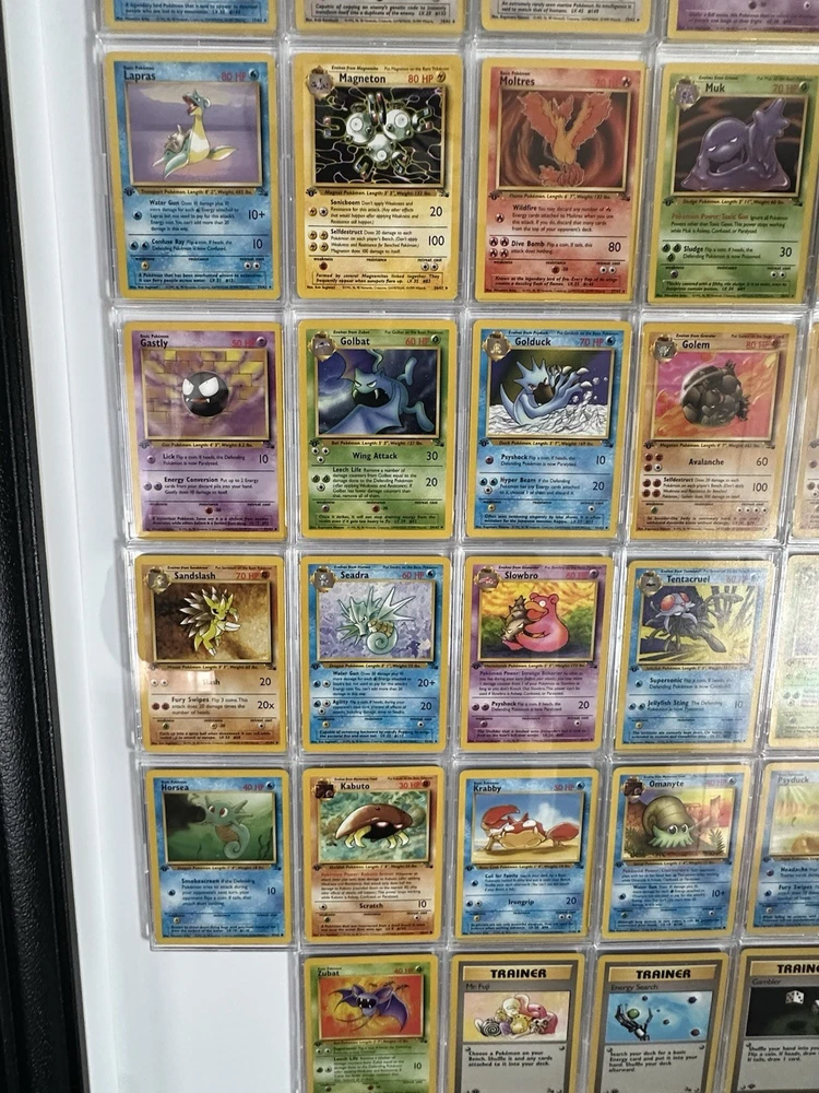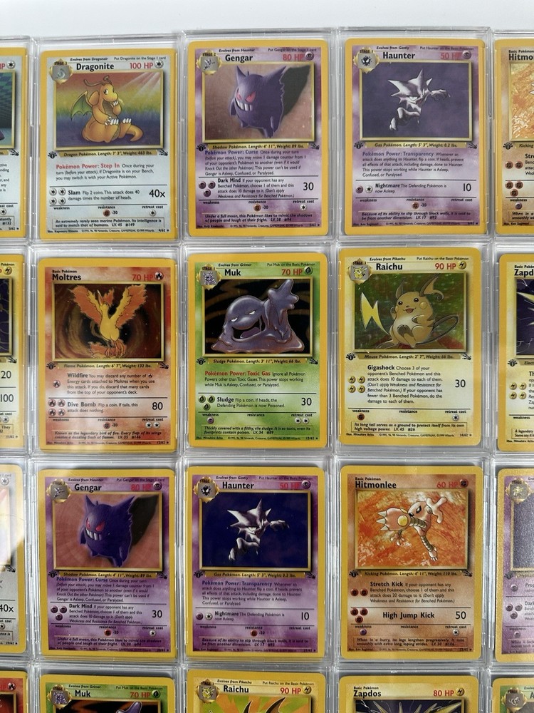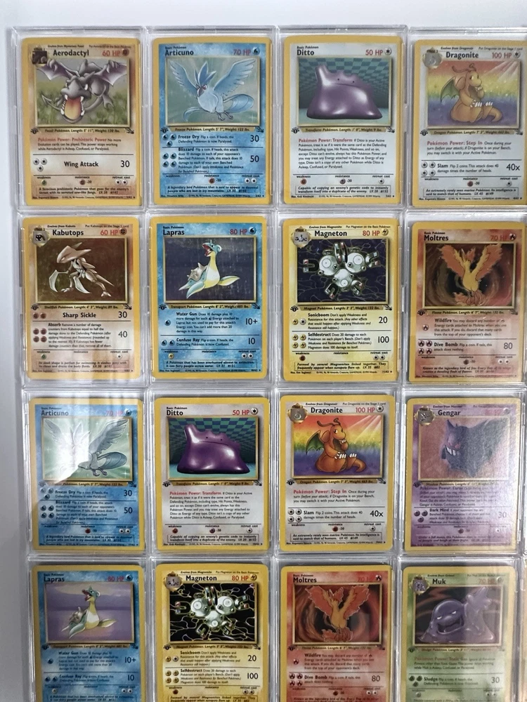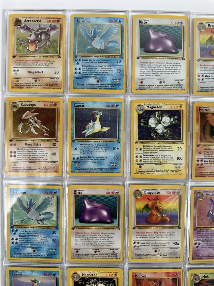 Complete 1st Edition Fossil Set – Pokémon TCG (1999) Framed Collector’s Display This is a fully complete 1st Edition Fossil Set (62/62) from the 1999 Wizards of the Coast Pokémon Trading Card Game release. Every card in this framed set is 100% authentic, 1st edition, and a preserved part of Pokémon TCG history. Authenticity: All cards have been professionally authenticated by PSA . While sold as ungraded , each card retains its original PSA label mounted inside the reverse of its individual acrylic case for verification and provenance. Condition: All cards are in near mint or better condition and individually sealed in crystal-clear acrylic cases for protection and display. Framing: The entire set is beautifully mounted in a custom 34" x 25.75" shadowbox-style frame, protected behind museum-quality, UV-resistant acrylic to ensure long-term preservation. Set Highlights: Includes all 62 cards from the original Fossil Set Key cards such as Articuno, Dragonite, Gengar, Moltres, and more Professionally arranged for visual balance and collector appeal This is a premium collector’s piece—perfect for display in a home office, game room, gallery wall, or personal Pokémon museum. A rare opportunity to own a full set of one of the earliest expansions in its finest form. Shipping & Handling: Securely packaged with full insurance. Local pickup is available upon request. Serious collectors only.