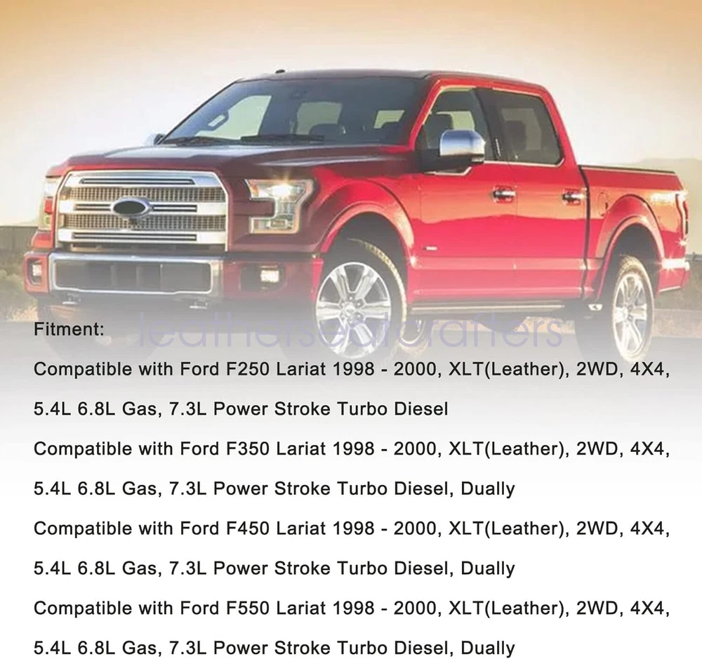 7Pcs For 1999 2000 Ford F-250 Lariat Front Leather Seat Cover Tan & Foam Cushion Details For 1999 2000 For Ford F250 F350 Drive r Side Bottom Foam Cushion & Front Leather Seat Cover Tan Product Compatible: Make: Ford Model: F250 F350 F450 F550 Lariat, XLT with Leather, FX4 Years: 1999 2000 Fit For: 1999 - 2000 Ford F250 Lariat, XLT(Leather), 2WD, 4X4, 5.4L 6.8L Gas, 7.3L Power Stroke Turbo Diesel 1999 - 2000 Ford F-350 Lariat, XLT with Leather, Crew-Cab, Single-Cab, 2WD, 4X4, 5.4L 6.8L Gas, 7.3L 6.0L Power Stroke Turbo Diesel 1999 - 2000 Ford F-450 Lariat, XLT with Leather, Crew-Cab, Single-Cab, 2WD, 4X4, 5.4L 6.8L Gas, 7.3L 6.0L Power Stroke Turbo Diesel 1999 - 2000 Ford F-550 Lariat, XLT with Leather, Crew-Cab, Single-Cab, 2WD, 4X4, 5.4L 6.8L Gas, 7.3L 6.0L Power Stroke Turbo Diesel Features: Type : Driver Bottom Foam Cushion & Front Leather Replacement Seat Cover Side : Left, Right, Front Color: Tan Material: Microfiber Leather & Foam Heated Seats: Fits Heated Seats and Non Heated Seats Power Seats: Fits Power Seats and Non Power Seats Vehicles Seat Cover's Attached Padding: ½ Inch attached foam padding Package Included: 1Set Front Driver & Passenger Leather Seat Cover ( 2 x Bottom Seat Cover & 2 x Lean Back Seat Cover) 1Pcs Driver Bottom Foam Cushion 2Pcs Armrest Cover (Driver & Passenger) About This Item: Warranty: 5 Year Fast & Free Shipping From KY or CA If you do not know how to install, please contact us , We can provide video installation instructions Tips: This Front seat cover, built to factory specs with Quality Leather to match the Interior of your vehicle! Our product is exactly the same as your existing cover and guaranteed to fit perfectly on your seat foam Pad. Any wrinkles seen in the pictures is from being in a box and guaranteed to disappear once installed Correctly. Please note this item is a replacement, not a slip on or pull over. The boxing/skirting is vinyl sewn onto foam like . Please Note: Our Leather seat cover matches with your cover. Actual Replacement Cover. NOT A SLIP ON or PULLOVER. You will remove the old cover & then install the New Cover. Communication is the best way to solve the problem. If you have any problems after purchasing, please contact us in time, before opening return or case. Shipping policy: Payment: Returns: About us: Shipping policy: 1.Orders are usually shipped within 24 hours after your payment(except weekends & official holidays). You can log on to eBay to check your logistics tracking number. 2.Please make sure to provide us with correct,precise and detailed shipping address before purchase, and cannot change it once purchased. Payment: PayPal payment accepted only.Please purchase and pay for the item through the eBay. Returns: 1.If any item is defective upon receipt or do not work, please contact us for the condition,we will provide a solution for such cases. 2.Return is accepted within 30 days after the buyer receiving the item. About us: 1.Thanks for purchasing in our store,if you have any questions, please contact us immediately. We will provide you with the high quality service. 2.If you are satisfied with our products, please give us a positive feedback. On Dec 19, 2024 at 23:45:48 PST, seller added the following information: