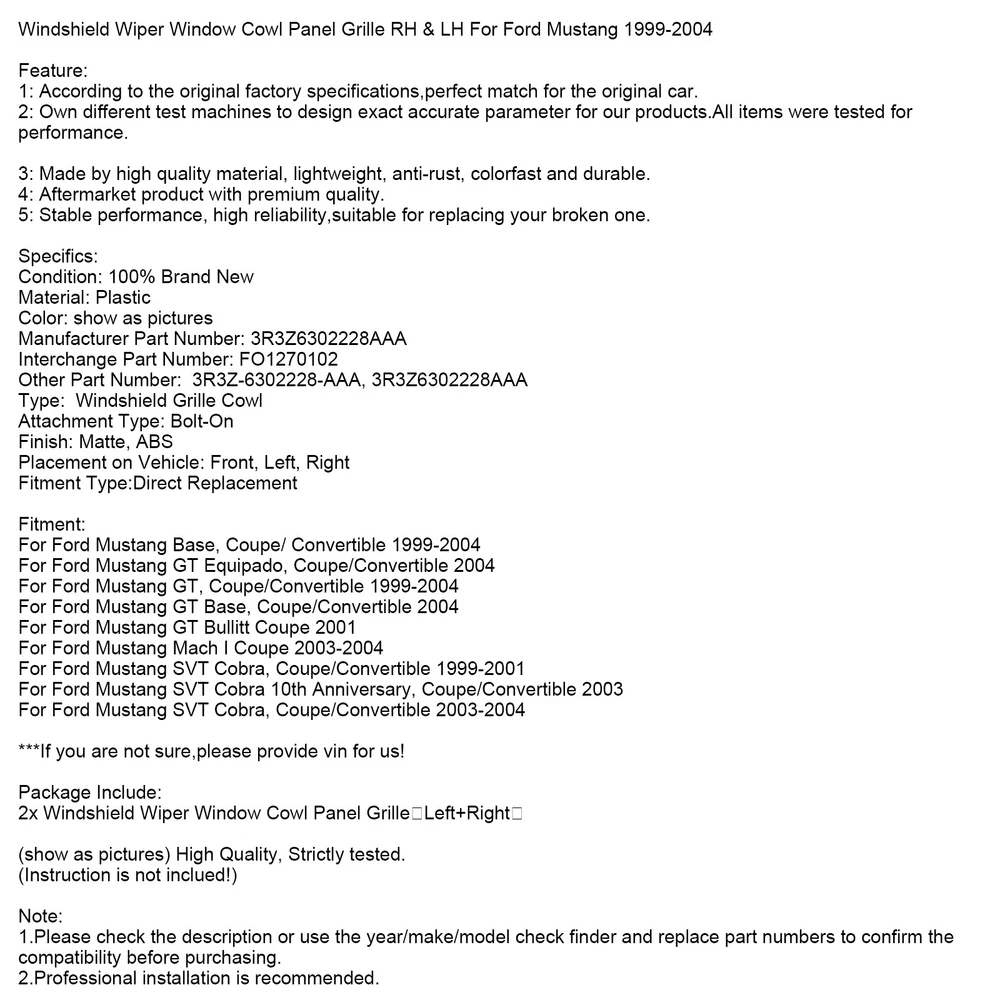 You may also like 2pcs Headlight Trim Ring For Mini Cooper One R50 R52 R53 2001-2006 64.85 USD Free shipping O/S Side Skirt End Cap 1771885 For Ford Fiesta MK7 20.85 USD Free shipping Carbon Fiber GPS Navigation Cover Trim Fit For Mini Cooper F54 F55 F56 F60 10-13 11.85 USD Free shipping Silver Dash Trim Rings Speedometer Gauge Cluster Panel For BMW E38 E39 E53 X5 20.85 USD Free shipping Rear Trunk Lid Weatherstrip Rubber Seal 64461-06060 For Toyota Camry 2007-2011 42.85 USD Free shipping Windshield Cowl Cover 51718159292 For BMW 525i 528i 530i 540i M5 1997-2003 73.85 USD Free shipping Left Driver Side Door Entry Keypad Pillar Molding Trim For Ford Explorer 11-19\ 59.85 USD Free shipping 4pcs Outer Weatherstrip Door Belt Seal For Toyota Land Cruiser FJ80 HDJ81 90-98 53.85 USD Free shipping Red Union Jack Smartphone Cell Phone Mount Holder For Mini Cooper R55 R56 R57 US 18.85 USD Free shipping 4pcs Front Door Window Belt Weatherstrip For Toyota Tacoma 2000-2004 85.85 USD Free shipping 2x Front M Sport Bumper Moulding Trims For BMW 7 Series F01 F02 2009-15 2014 63.85 USD Free shipping Magnetic Rain Water Cover For Electric Vehicle Car EV Charging Port Jack Hood 22.85 USD Free shipping Windshield Wiper Window Cowl Panel Grille RH & LH For Ford Mustang 1999-2004 Feature: 1: According to the original factory specifications,perfect match for the original car. 2: Own different test machines to design exact accurate parameter for our products.All items were tested for performance. 3: Made by high quality material, lightweight, anti-rust, colorfast and durable. 4: Aftermarket product with premium quality. 5: Stable performance, high reliability,suitable for replacing your broken one. Specifics: Condition: 100% Brand New Material: Plastic Color: show as pictures Manufacturer Part Number:3R3Z6302228AAA Interchange Part Number: FO1270102 Other Part Number: 3R3Z-6302228-AAA, 3R3Z6302228AAA Type: Windshield Grille Cowl Attachment Type:Bolt-On Finish:Matte, ABS Placement on Vehicle:Front,Left,Right Fitment Type:Direct Replacement Fitment: For Ford Mustang Base, Coupe/ Convertible 1999-2004 For Ford Mustang GT Equipado, Coupe/Convertible 2004 For Ford Mustang GT, Coupe/Convertible 1999-2004 For Ford Mustang GT Base, Coupe/Convertible 2004 For Ford Mustang GT Bullitt Coupe 2001 For Ford Mustang Mach I Coupe 2003-2004 For Ford Mustang SVT Cobra, Coupe/Convertible 1999-2001 For Ford Mustang SVT Cobra 10th Anniversary, Coupe/Convertible 2003 For Ford Mustang SVT Cobra, Coupe/Convertible 2003-2004 ***If you are not sure,please provide vin for us! Package Include: 2x Windshield Wiper Window Cowl Panel Grille(Left+Right) (show as pictures) High Quality, Strictly tested. (Instruction is not inclued!) Note: 1.Please check the description or use the year/make/model check finder and replace part numbers to confirm the compatibility before purchasing. 2.Professional installation is recommended. -About US Founded in 2012, VIPJQ have professional development and sales, and are involved in various products, providing customers with various high-quality products. Since its establishment, VIPJQ has always adhered to the service concept of "customer first" and the management concept of "pursuit of quality", and is committed to providing customers with high-quality original designs. We commit to provide you the best innovative, quality products & professional services with competitive prices. We value every customer, and we look forward to providing solutions for your business needs to help your business achieve its goals, please contact us immediately! We are all about you! We are a Japanese seller,but with large warehouse in USA. We are profesional on Auto Parts,Car Parts,Motorcycle Parts,3C,other hot sale items and so on. We aim to provide to customers high quality product and best service. -About Shipment&Returns The item usually will be dispatched within 3 days after you ordered.All are free shipping. And it usually takes 3-10 working days to delivery depends on buyers' address or other majeure on the way. If you are not satisfied with the items and want to return the item,we hope you could message us first,we will give you the return details, we think we could give you the best service to save your time and money.Thank you. -About Feedback&Customer Service If you are enjoy your shopping here,not only enjoy the items but also the service,we are appreciate you could give us a 5-star feedback. If you are not satisfied with the item,before you give us the negative feedback,we hope we could give you the best solution through our commutication. We think we could do it if you give us the chance.Thank you.