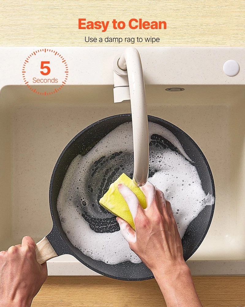 Features: · 19-Piece Cookware Set: A versatile pots and pans set that includes: 6in sauce pan with lid, 7in sauce pan with lid, 8in frying pan, 9in frying pan, 11in frying pan, 11in saute pan with lid, 11in stockpot with lid, 11in square grill pan, 2 10x10in pan protectors, 3 14x14in pan protectors, silicone spoon, silicone shovel · Premium Material: Made with a Maifan stone non-stick coating, this cookware set ensures easy food release and effortless cleaning. The interior withstands temperatures up to 380°C, making it reliable for daily use. The cookware does not include lead, cadmium, and PFOA. Cook with less oil for a healthier meal experience · Compatible with All Stovetops: Crafted from 2.5mm thick aluminum, the rv cookware base heats quickly and evenly. The high-magnetic conductive bottom makes it suitable for all stovetops, including gas, electric, and induction · Multi-Purpose Cookware: Versatile and functional, this space saving pots set seamlessly transitions from stovetop to grill, and tabletop. Its elegant and modern design enhances the presentation of your dining experience · User-Friendly Design: Featuring heat-resistant silicone handles, this kitchen cooking set provides a comfortable grip while preventing burns. The transparent glass lids allow for easy monitoring of your food while cooking. Effortless to clean, it wipes down in seconds, making kitchen maintenance simple.