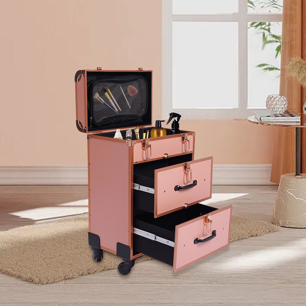Description This is a movable multi-layered makeup case designed for professional beauty artists to make up anytime and anywhere. This rolling makeup case is constructed of high-quality aluminum alloy that is sturdy and durable. It has extra large capacity compartments and multi-layer drawers. This case is ideal for all people who love beauty or nail art. Key Features High-quality Materials: The frame of the makeup case is wrapped with high-quality aluminum alloy, which will not easily rust and fade. And the thicker, all-aluminum drawbar makes the case more stable, refusing to shake. Large Capacity: This makeup case has 3 layers, the top layer can store nail polish or lipstick; the bottom two drawers can store full-size cosmetics and beauty appliances, such as perms, manicure mac 1*Alu Travel Rolling Makeup Train Case Cosmetic Trolley Makeup Storage Organizer Welcome~ Description This is a movable multi-layered makeup case designed for professional beauty artists to make up anytime and anywhere. This rolling makeup case is constructed of high-quality aluminum alloy that is sturdy and durable. It has extra large capacity compartments and multi-layer drawers. This case is ideal for all people who love beauty or nail art. Key Features High-quality Materials: The frame of the makeup case is wrapped with high-quality aluminum alloy, which will not easily rust and fade. And the thicker, all-aluminum drawbar makes the case more stable, refusing to shake. Large Capacity: This makeup case has 3 layers, the top layer can store nail polish or lipstick; the bottom two drawers can store full-size cosmetics and beauty appliances, such as perms, manicure machines and light therapy supplies. This multifunctional product can meet your storage needs. Excellent Weight-bearing Capacity: The rectangular construction and aluminum alloy frame give the case a superb load-bearing capacity (up to 110.3 lbs). You can safely put all your hair and beauty tools on it. Sorted Storage: Beauty products with different functions and sizes are stored in the corresponding drawer and compartment, making the tools ranged orderly, so it is convenient for you to quickly find the tools you want. Easy to Move and Carry: The universal wheels are easy to move and very convenient, especially for nail salons and beauty salons that have a lot of tools and need to move frequently. And it comes with a telescopic pull bar ( maximum length is 32.7inchs ) and a top handle, which is easy to carry on trips and business trips. Stylish Appearance: This rolling make-up case gives a stylish and exquisite look with its simple construc tion and stylish gold . Such a retro make-up case will decorate your dressing room well and make a good impression when you are working outside. Secure & Reliable: The metal locks of the case protect the contents securely and the lockable design ensures security and privacy. Worry-free Service: We have been working hard to provide better service and quality for our customers, which is our goal. If there is any quality problem with our products. Please contact us in time. Details Transparent Storage Bag: The transparent storage bag on the inside of the lid allows for wet and dry storage, for example, you can store wet beauty eggs and powder puffs to avoid cross-contamination. Rounded Edges: The top of the cosmetic case has been designed with rounded corners rather than sharp edges to avoid scuffing. Reinforced Lock: Reinforced lock not only makes it convenient for you to open and close, but also does not affect the appearance, and solves the embarrassment of bursting when going out. Application This rolling make-up case is suitable for professional make-up artists, hairdressers, nail technicians, and beauticians in beauty centers, salons, private homes, parties, and other occasions. Specification Number of Layers: 3 Color: Gold Material: Aluminum Alloy Frame and Plastic Fireproof Board Panel Shape: Rectangular Processing Method: Frosted Rolling Wheel Style: Universal Wheel Carrying Parts: Retractable Handle Gross Weight: 9kg/ 19.8lbs Net Weight: 7.5kg/16.5lbs Package Size: 57*42*32cm/22.4*16.5*12.6inch Product Size: 36*23*58cm/14.2*9.1*22.8in Maximum Load: 50kg/110.3lbs Package Included 1 x Makeup Case 4 x Universal Wheels 2 x Keys Notes Please allow the slight color difference caused by the shooting light and 1-3cm error due to manual measurement, and make sure you do not mind before you order. Welcome to Rongorange View more↓ Payment Delivery details Terms of sales About us Contact us Payment We accept ebay payment 。 Fees such as import duties, taxes are not included in the item price or shipping costs. These charges are the buyer's responsibility. Delivery details Shipping: 2-9 working days to: USA Terms of sales We maintain high standards of excellence and strive for hundred percent customer satisfaction. Feedback is very important to us. We hope that you contact us immediately before you give neutral or negative feedback, so that we can address your concerns. It is impossible to address issues if we do not know about them! About us Your satis faction is our ultimate goal. We work hard to earn your trust and future business. Our certified technicians have tested each item before shipping. The unit comes with 1 year limited warranty on all manufacturing defects. a) If you receive a defective item, you may return it or ask for a discount. Please contact us within 14 days after you receive the package. b) What you returned must be intact and in its original packaging as re? u. Customer is responsible for shipping costs of the returned item. c) We will cover the cost of shipping back t with the shipping rate indicated in the registration page. We will send you a new unit or refund the full payment you paid. Thank you. Contact us Business Hour Business Hour: Monday To Friday: 8:30 AM to 5:00 PM (Beijing China time) Due to time zones, our reply to your questions may not be immediately. But within above working time