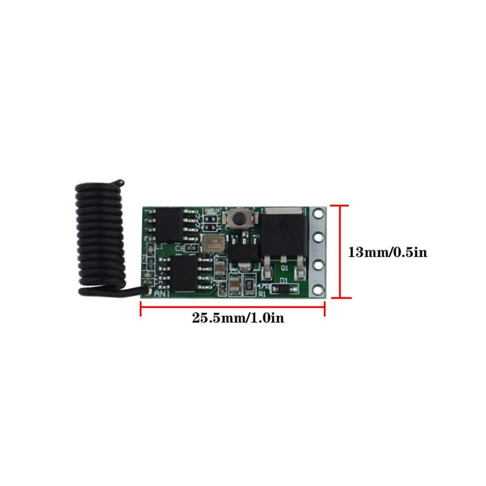 Product Description 433mhz DC 3.6V 5V 12V 24V 1CH LED Lamp Controller Micro Receiver for Remote Control Switch Specification: Working voltage: DC 3.6V~24V Maximum load: 2A Static current: <5 mA Working frequency: 433MHz Reception sensitivity: <-108dBm Size: 25.5 mm x 13mm x 5mm (length × width × high) Mini size support coding format 1527 learning code Input: DC 3.6V ~ DC 24V Output: DC 3.6V ~ DC 24V Modulation mode:ASK (superheterodyne) Appearance size: 25.5mmx 13mm x 5mm (length × width × high) Number of stored remote controls: ≤ 10 Working mode: Momentary, Toggle, Latching Mode Learning style: Learning Button Working temperature: -20 degrees 80 degrees. Features: ·Application environment: Wireless control LED lamp string, Christmas tree light string, Light control switch. ·Long range working voltage ·Ultra low power,High sensitive response .Operating Voltage: DC 3.6V-24V .Encoding : EV1527 Learning code About Working mode: Momentary:Push the remote button , the relay connects, release the remote button , the relay dis-connects. Toggle:Push once the remote button , the relay connects , push twice the remote button , the relay dis-connects. Latching:Push the remote button A, the relay connects, push the remote button B, the relay dis-connect. Tiem delay mode :Push the remote control button , the relay connects , from when release the remote button , after 5s or 10s or 15s or 20s , the relay disconnect automatically. Automatic energize when power on mode: when power supply, the relay connects. Clearing the code : After push the receiver's learning button 9 times , the receiver Clear all the remote control data in its memory. When the LED flashes for 5 few times,it indicates that the clear function is completed. (After cleared the code in the receiver,all the remote control must study from receiver onece again to restart.) Receiver operating mode Settings 1.Learning the code :(momentary) Push the learning key on the receiver once time ,it comes into momentary setting mode. Wait for a moment ,the LED will be on, it comes into learning state .Push the remote button , LED indicator on the receiver board will flash 3 times and then come off ,learning successfully. 2.Learning the code : ( Toggle ) Push the learning key on the receiver twice time , it comes into toggle setting mode Wait for a moment ,the LED will be on , it comes into learning state .Push the remote button ,LED indicator on the receiver board will flash 3 times and then come off, learning successfully . 3.Learning the code :( Latching ) Note: When you choose for latching mode ,in order to learn more remote control ,you need to learn two different button,the first time learnt is for “ON”, the second time learnt for“OFF”. For example : button A = ON , button B = OFF ,Push the learning key on the receiver triple time , it comes into latching mode .Wait for a moment , the LED indicator on thereceiver board will be on, Push the remote button A,LED flash for 3 times .Push the remote button B .LED indicator flash for 3 times and then come off, learning successfully . 4.Learning the code :( Time delay mode ) Push the learning key on the receiver forth time , the time dealy for 5 seconds. Push the learning key on the receiver fifth time , the time delay for 10 seconds. Push the learning key on the receiver sixth time , the time delay for 15 seconds. Push the learning key on the receiver seven time , the time delay for 20 seconds. The LED indicator will be off. Push the remote button , LED flashes and off ,learning successfully. 5.Learning the code : (Automatic energize when power) Push the learning key on the receiver eight times , it comes into setting mode Wait for a moment, the LED will be on , it comes into learning state .Push the remote button,LED indicator on the receiver board will flash 3 times and then come off, learning successfully. NOTE: The system can store for 20 pcs of remotes , if the remote get more than 20 pcs , the initial remote control will be lost. Package Included: 1x Mini Wireless RF Remote Control Light Switch Receiver module (1527 Encoding ); Payment Shipping Returns Contact Us We accept all verified payments from ebay. Orders will be shipped after receiving cleared payment. Payment due within 7 days after auction ends and for buy it now listings. We ship most of our orders within 24 hours, and may up to 48 hours for. If you want faster shipping way. Please contact us before making payment. Sometimes due to problems with our transportation company system, your shipping information may be delayed to update. We recommend that you try again after 3-4 days. If you still haven't checked the shipping information, you can contact us by ebay message. Always believe we can figure things out with communication, if it comes to return, the pacakge must be intact and the same as you receive. If you have any questions, please feel free to email our service specialists 24 Hours a Day, 7 Days a Week. We will reply you ASAP. Return/refund is accepted within 30 days after the buyer receives the item. NO exchange will be accepted after 30 days from the date when the item is received. Please contact us first before returning your product!!! If you have any questions, our Customer Service staffs welcome you to email us. We strive to answer all questions and resolve any problems as quickly as possible. You can contact us 7*24, we will reply at the first time, and we will surely solve your problems. Note: 1.We try our best to reply to your emails as soon as possible, however, due to high volume of daily incoming emails and time zone difference, we may not be able to reply your emails immediately. Please allow 1 business days for us to response. If you do not receive any reply from us, please check your email ensuring your mailbox has not reached full size. 2.Due to some ISP SPAM filter settings, you may not be able to receive our replies; if you have problems receiving our emails, you may need to use a different emai