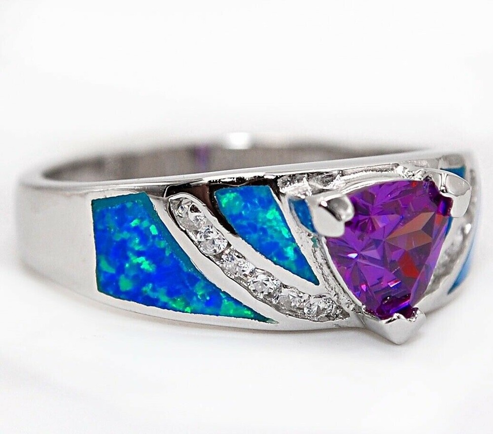1CT Amethyst and Australian Opal Inlay S925 Sterling Silver Ring Size 8 Elegant Jewelry BA1