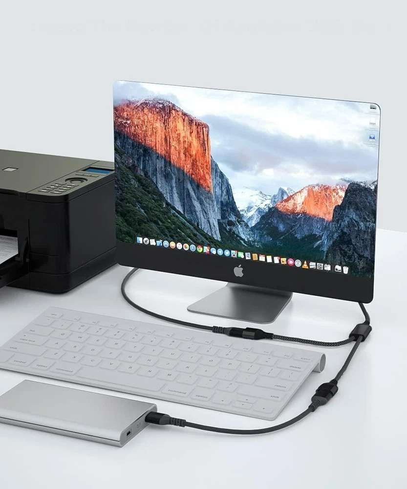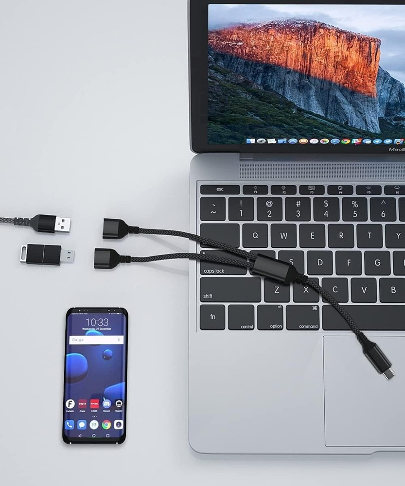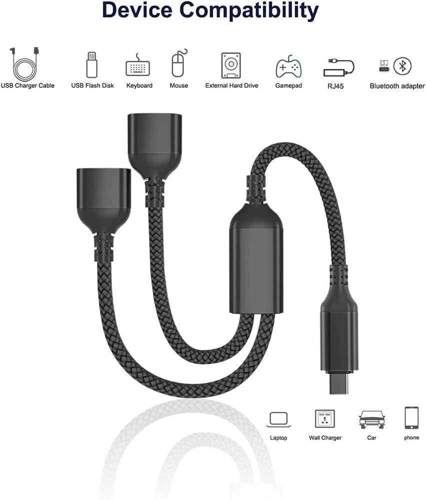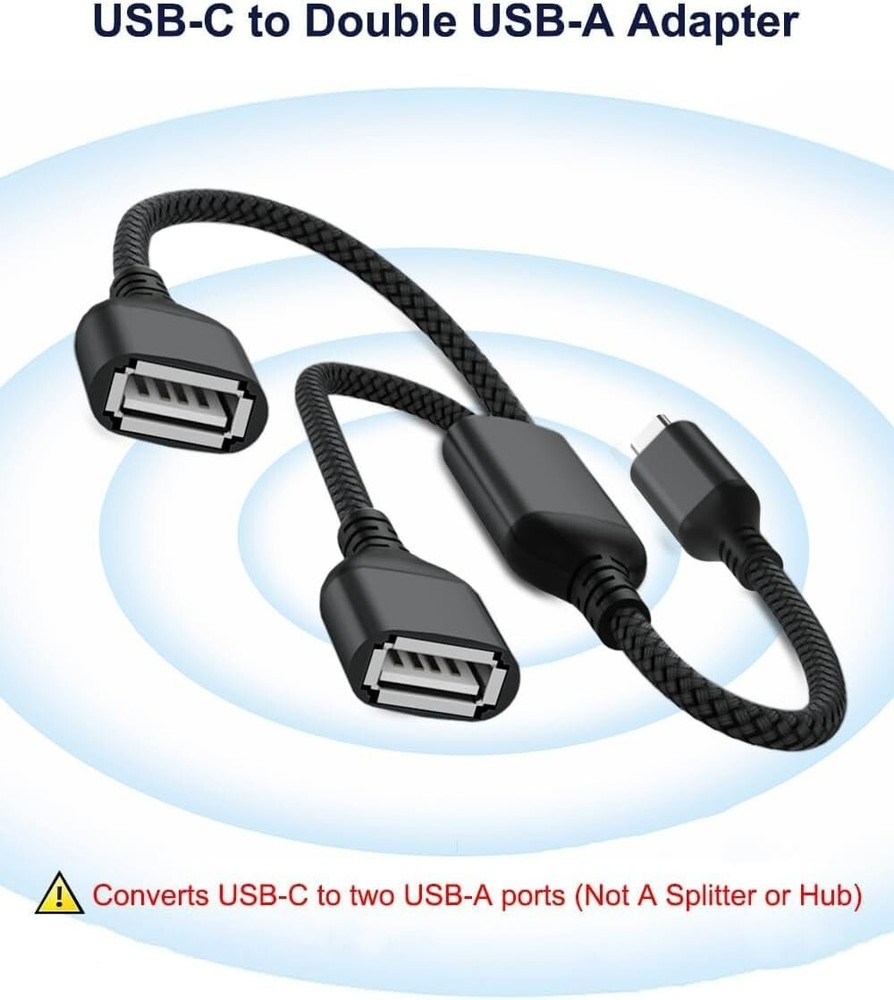 USB C Male to Dual USB Female Cable Adapter 1FT,Thunderbolt 3 to Double Type A OTG Splitter Cord Converter for MacBook,iPad Air Mini,Microsoft Surface Go,Galaxy Note 20 S23 S21 S22 (The Catch) No product is perfect, neither is this one. The rated voltage and current is 5V and 2A for this adapter, meaning each sub-cable of this adapter gets 1A when they are used at the same time. For more info, refer to the detailed description down below. (Less Constraint, More Freedom) Need more USB-A ports because all the new gadgets are coming without them? This USB-C to Double USB-A Adapter could just be your life-saver. Now you can use your USB-A heritage accessories with the help of this splitter even on devices with only one single USB-C port. (Notice: This is a USB splitter). (Less Chaos, More Order) Need to simultaneously connect to your accessories like keyboard and mouse but don't want too many cables messing up your working space? Now you can. This USB-C to dual USB Adapter makes it possible to connect to two devices with one single cable so that you are free from all the hassle of two tangled cables. (Less Wearing, More Saving) Tired of your wallet constantly getting worn and becoming thinner along with the wearing of other shoddy splitters? With double-braided nylon and aluminum casing that are not sensitive to twists and bends, this cable can last longer than you can imagine. (Less Confusion, More Concentration) With no need to download and install extra drive, you can simply plug this splitter in your device and start using it right away. No confusing configuration, no time-consuming adjustments. It's easy to stay focused with this USB cable.